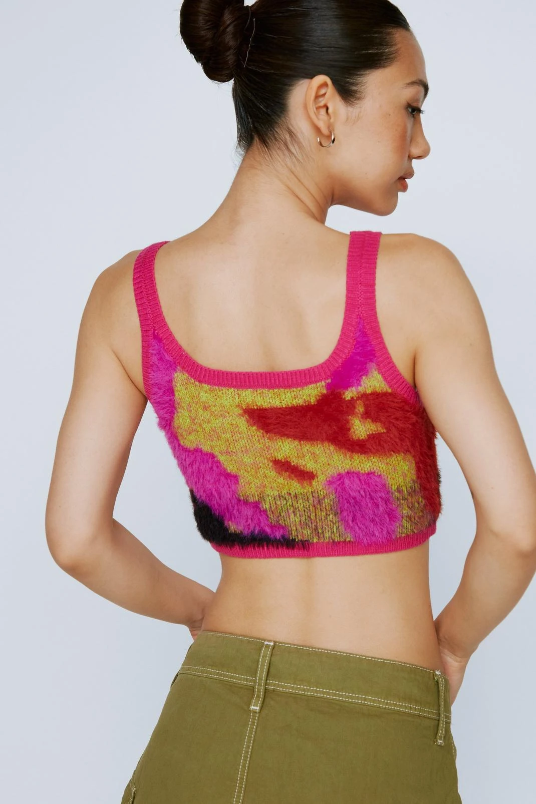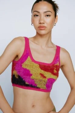 Look on the bright side. Add some comfort and color to your everyday looks with our abstract print fluffy bralet . Style alone or with the matching cardigan.