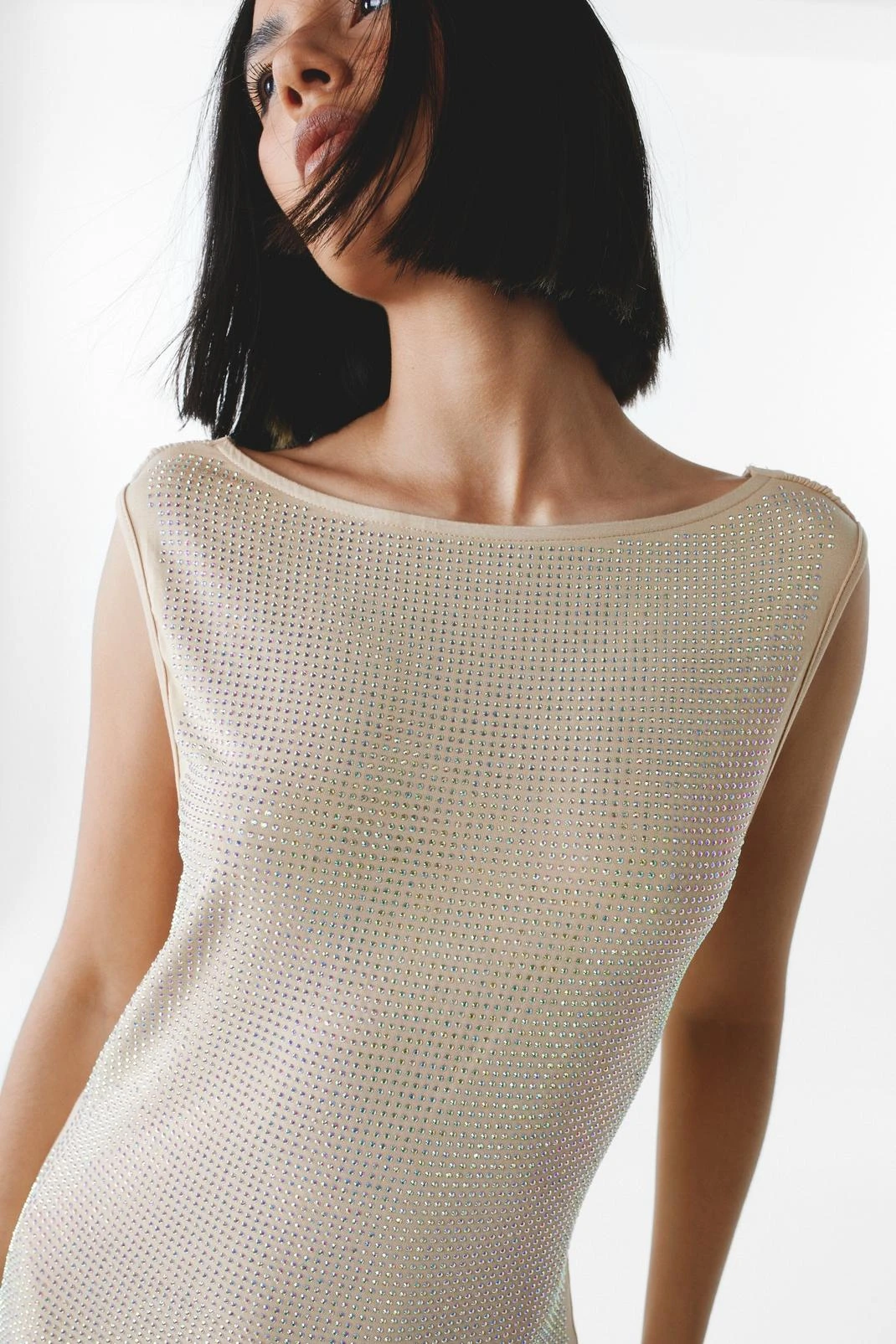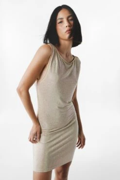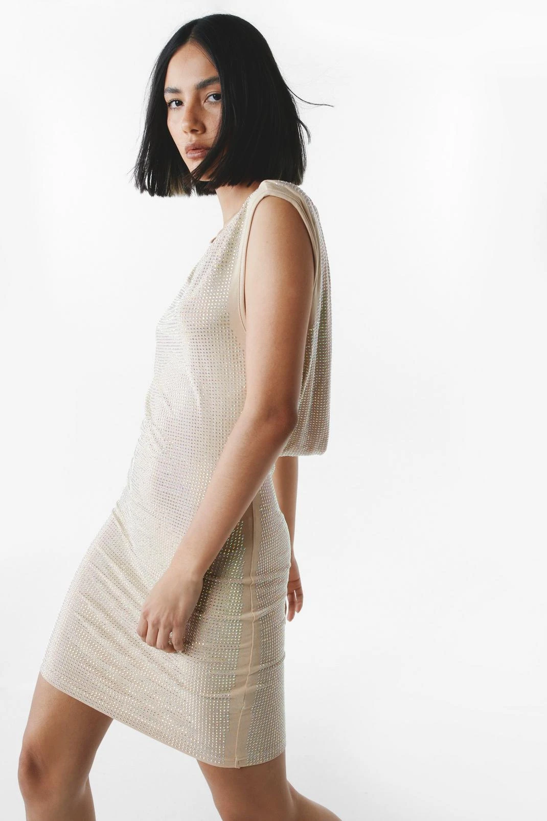 Dress it up. Feel fierce in our mini dress, with sparkling diamante detailing, a statement cowl back, and an ultra flattering silhouette. Pairs well with strappy heels, for a look that will take you anywhere from happy hour to disco ball dancefloors.