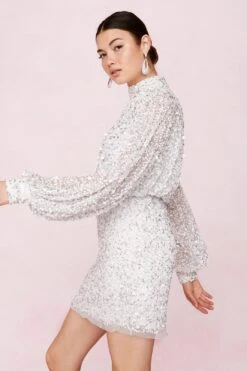 A little commotion for the dress? This dress comes in breathable mesh, making it the perfect ensemble for those spontaneous twilight tangos. It features a high neckline, relaxed bodice, bodycon mini skirt, natural waistline, long balloon sleeves, romantic open back with zip down closure, and all-over sequin embellished design. Style yours with slip on mules, or toughen up with real leather Chelsea boots.