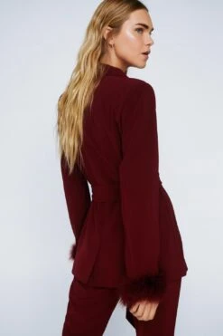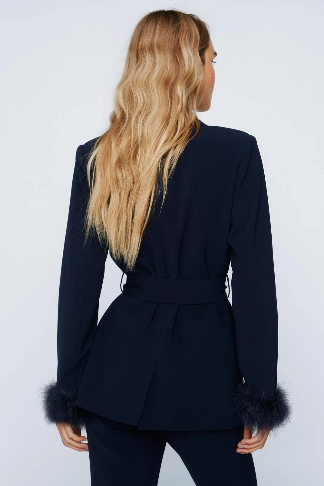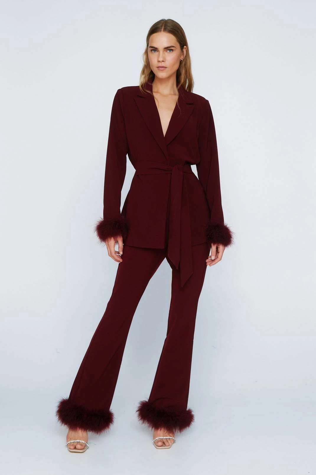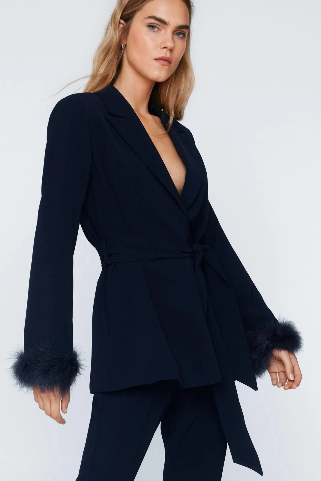Ruffle some feathers. Our belted blazer with feather cuffs offers a touch of texture to your party season outfit. Style with the matching pants.