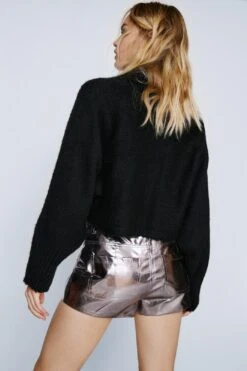 Sweater season. Feel cozy in our knit sweater, made in high quality brushed knit fabric, with a fun cropped length and a cozy high neckline. Pairs well with jeans or leather pants and boots for a failsafe daytime look, perfect for wearing to the office, for casual coffee dates, and lunch catch ups.