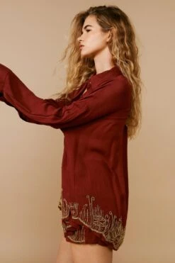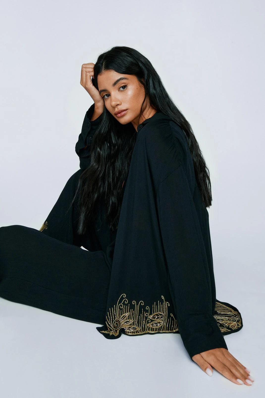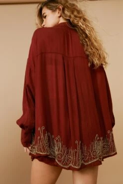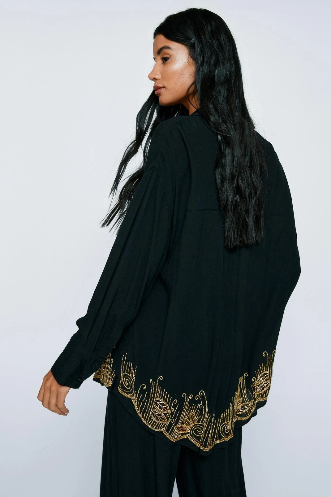 Beach days pending. Feel sunkissed in our oversized cover up shirt, made in high quality crinkle fabric, with a sparkling beaded design, comfortable oversized fit, and button front fastening. Wear it with the matching pants and sandals for a look that can take you seamlessly from the beach to the bar.