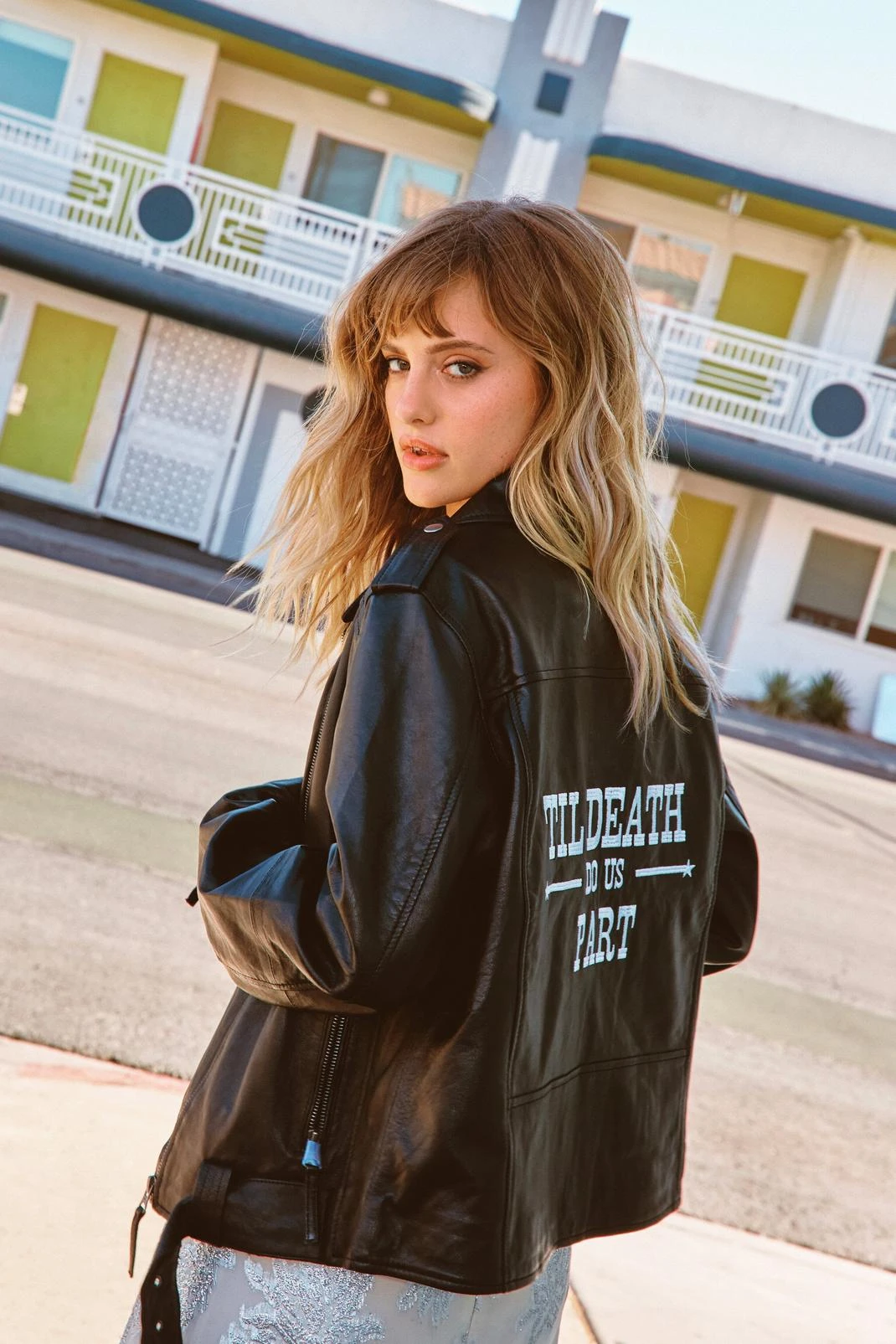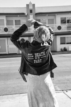 Ride off into the sunset. This jacket comes in leather and features a moto design, relaxed silhouette, belt design at hem, pockets at front, zip detailing at sleeves, and ‘Til Death Do Us Part’ embroidered at back.