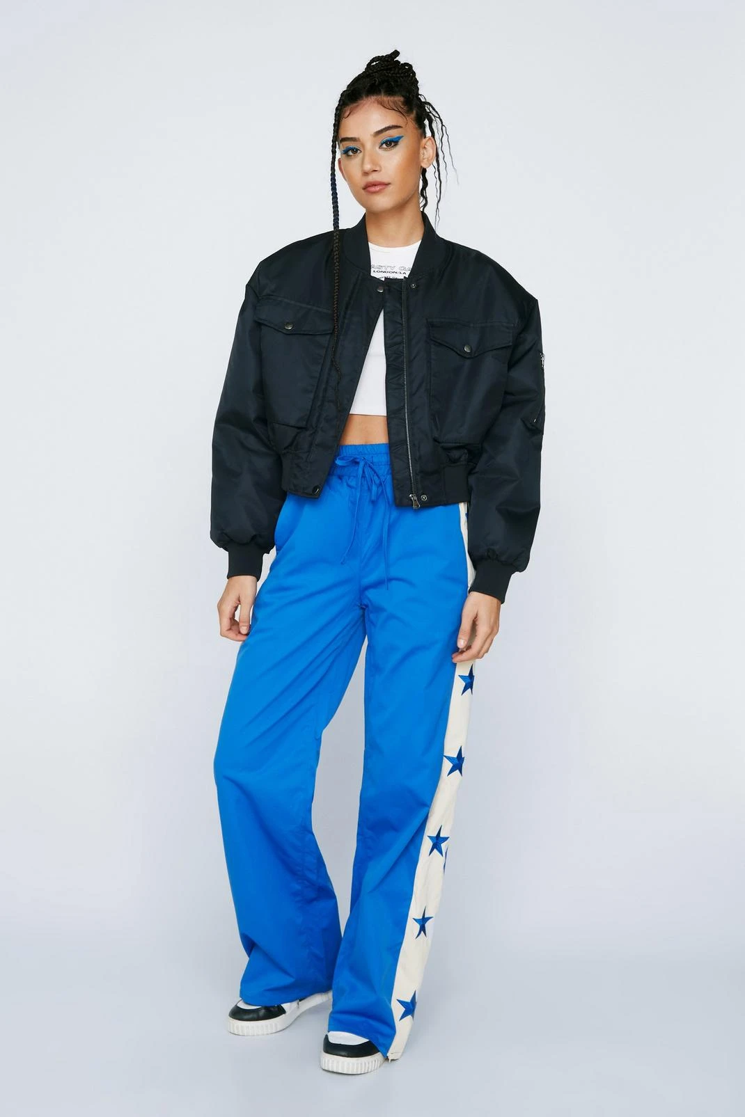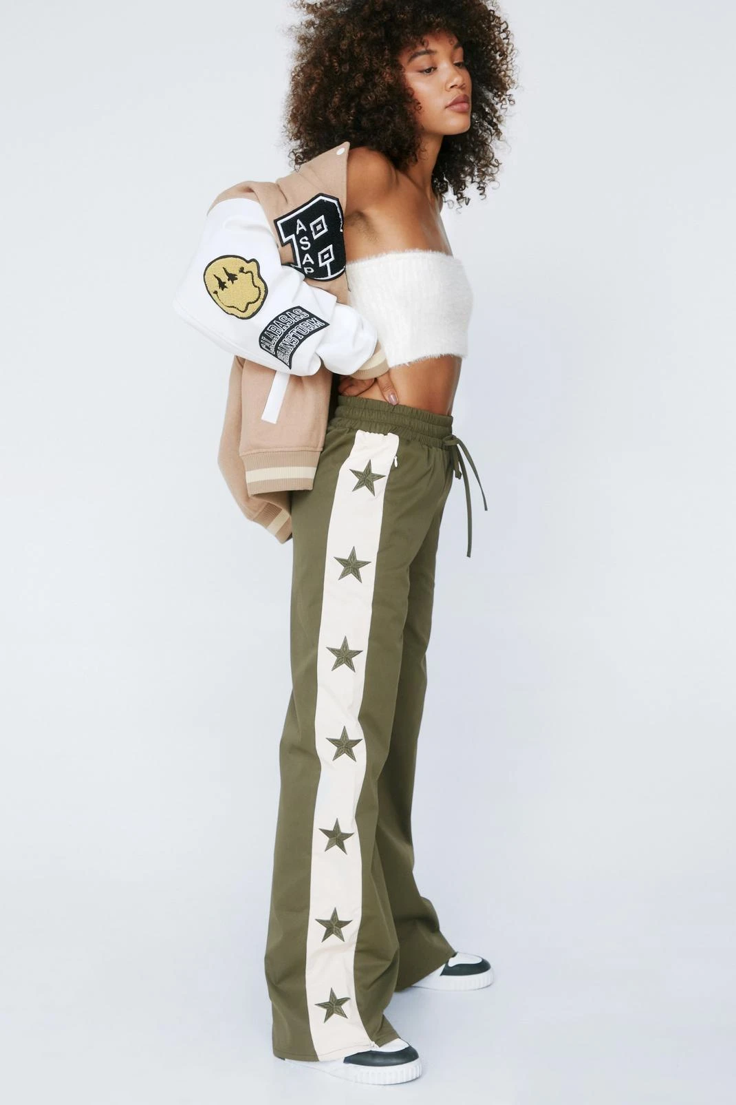 Star power. Contrast against a fluffy crop top, varsity jacket, and chunky sneakers.