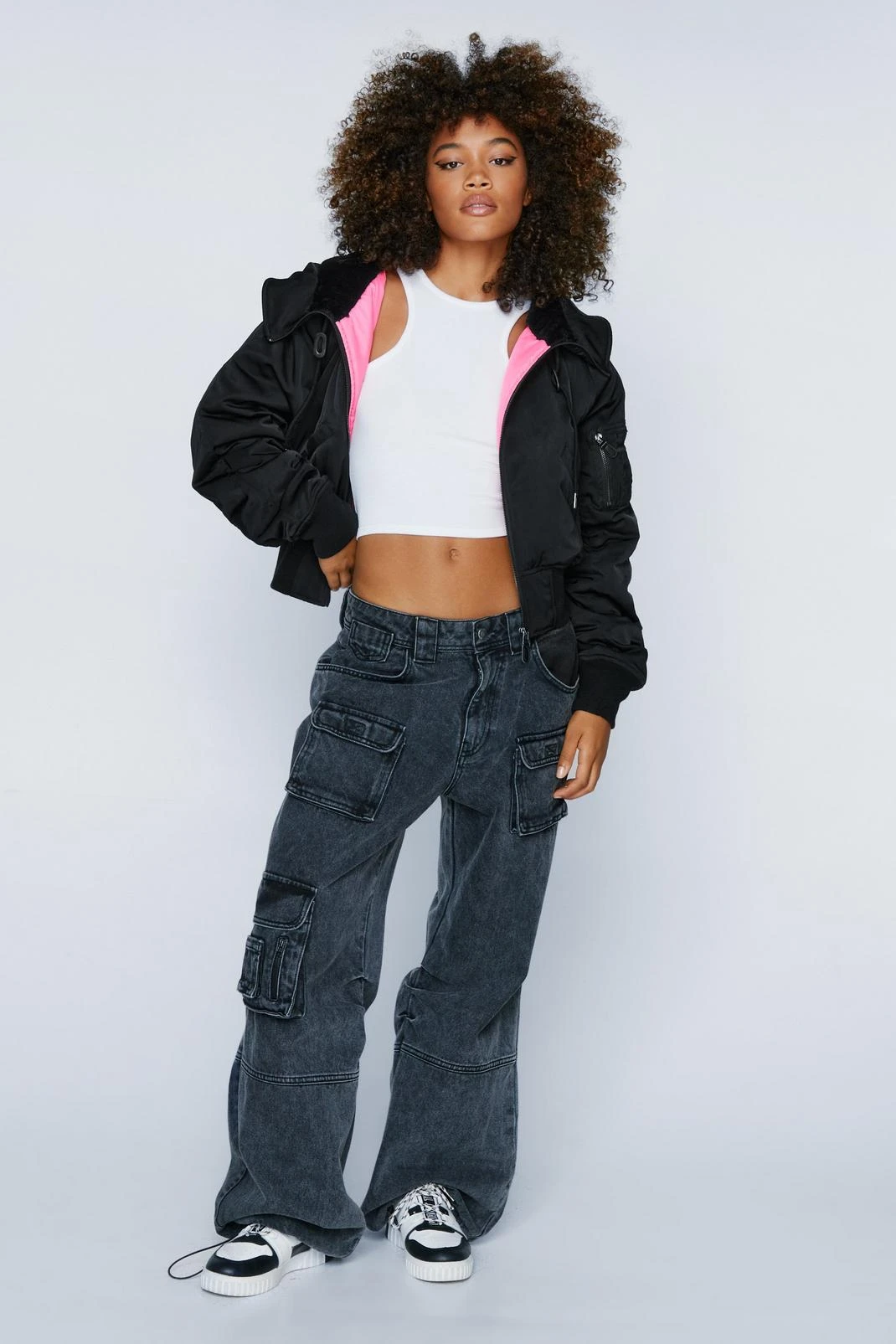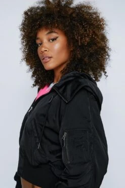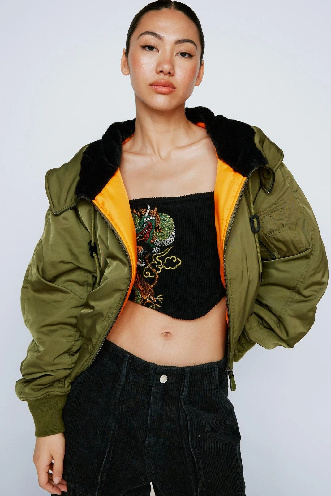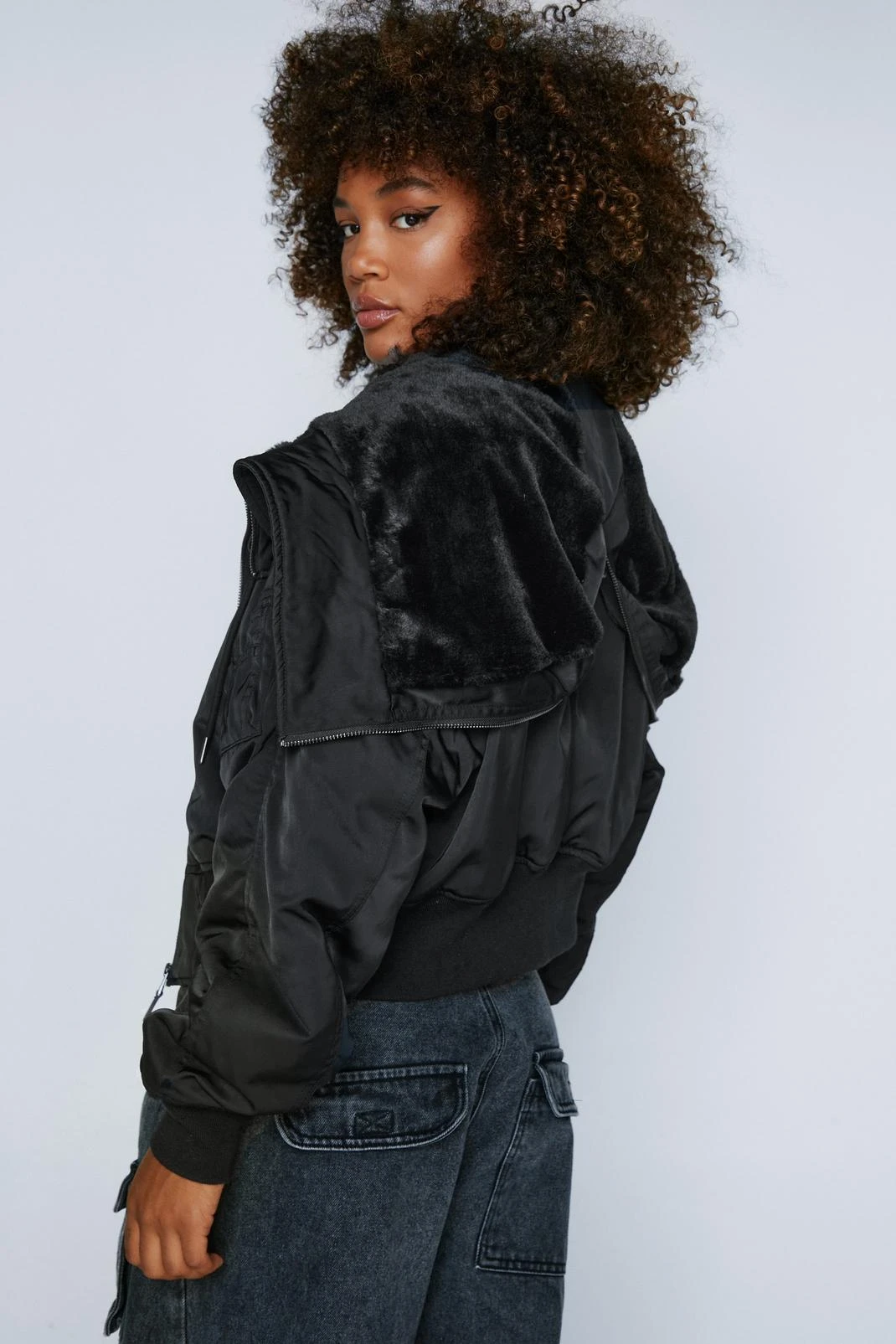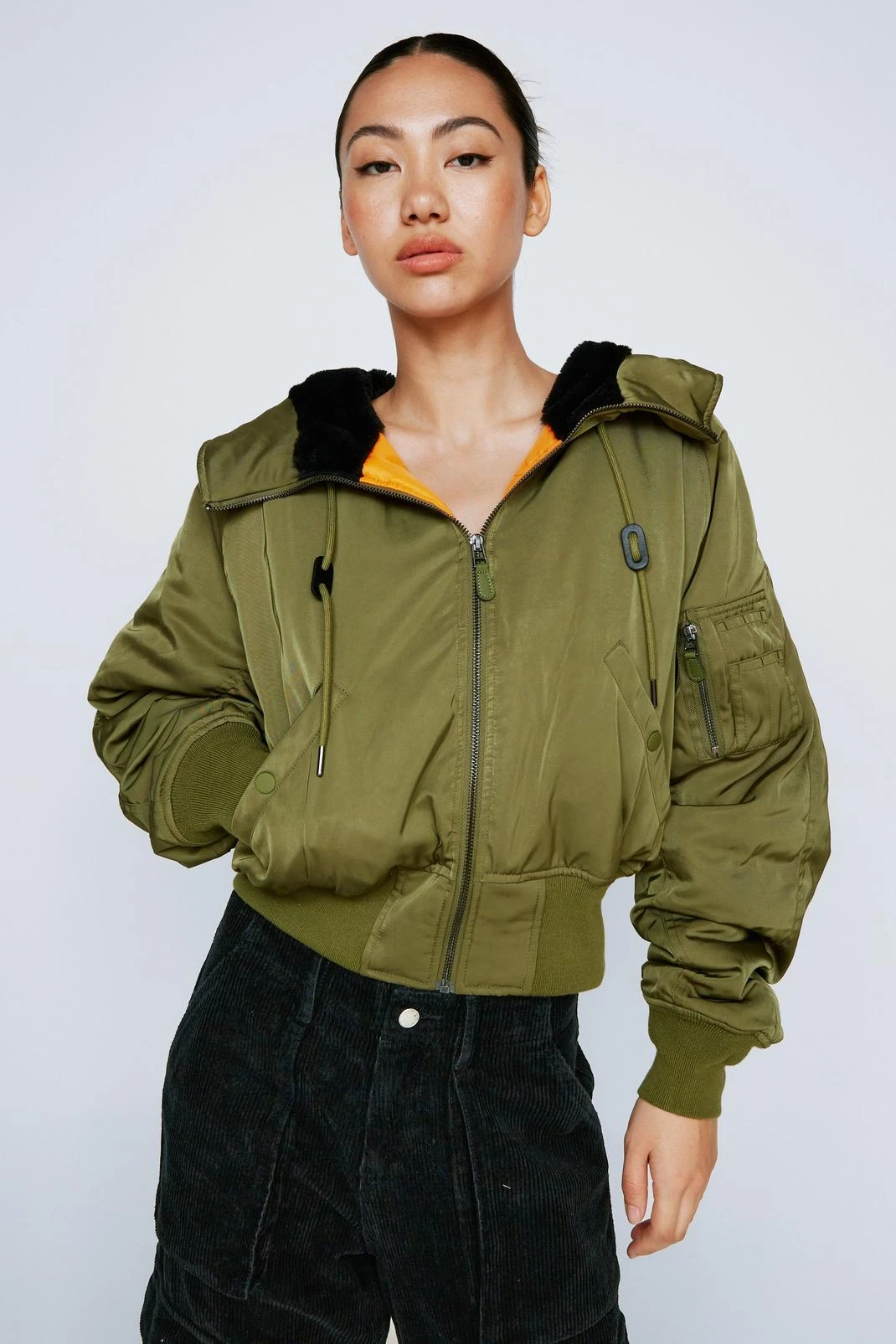 Essential outerwear. Our faux fur lined bomber jacket features a zip hood and pocket details, and pairs well with pretty much every day outfit in your closet.