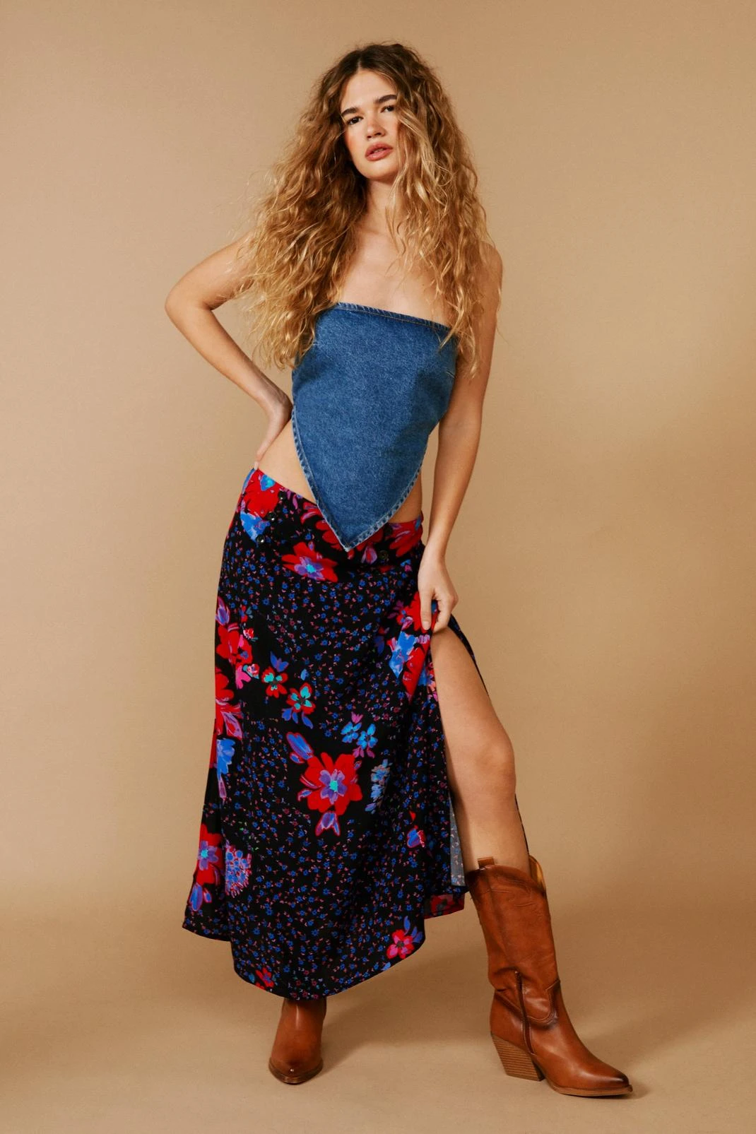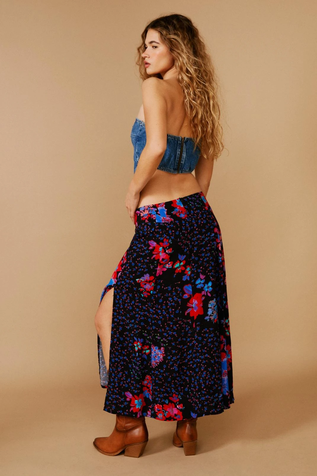 Down here. Feel feminine in our midi skirt, with a cute floral print, a flattering, relaxed silhouette, and a comfortable mid rise waistline. Style with boots and a corset top for a look that will take you anywhere, from vacation days to festival weekends.