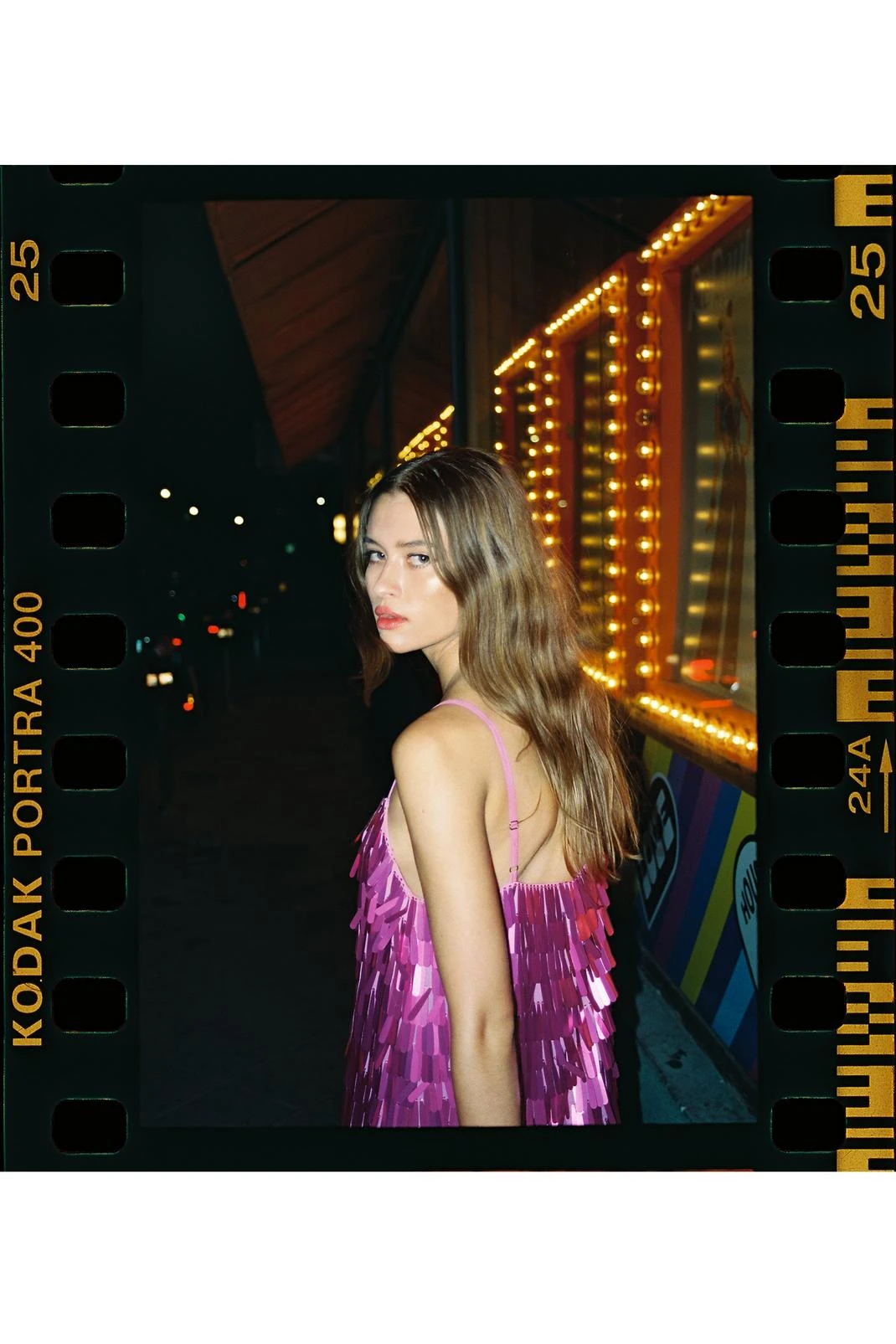 Flirty fringe. Feel fierce in our mini dress, made in high quality sequin fabric in a layered fringe design, with a stellar straight fit and straight neckline. Pairs well with strappy heels for an elevated look that will take you anywhere from party nights to date nights.