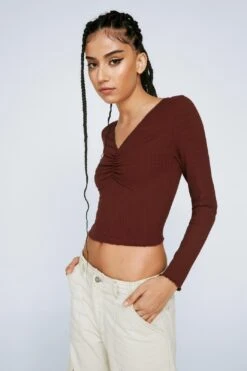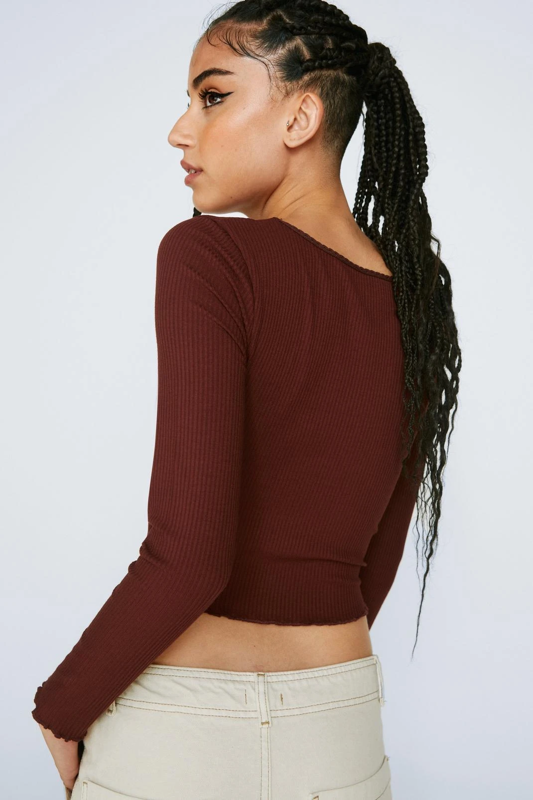 Top priority. Feel cute in our long sleeve top, in high quality ribbed fabric, with a fitted design and subtle lace trim details. Style with a high waisted skirt or cargo pants for an elevated daytime look, perfect for office days and casual days out with the gals.