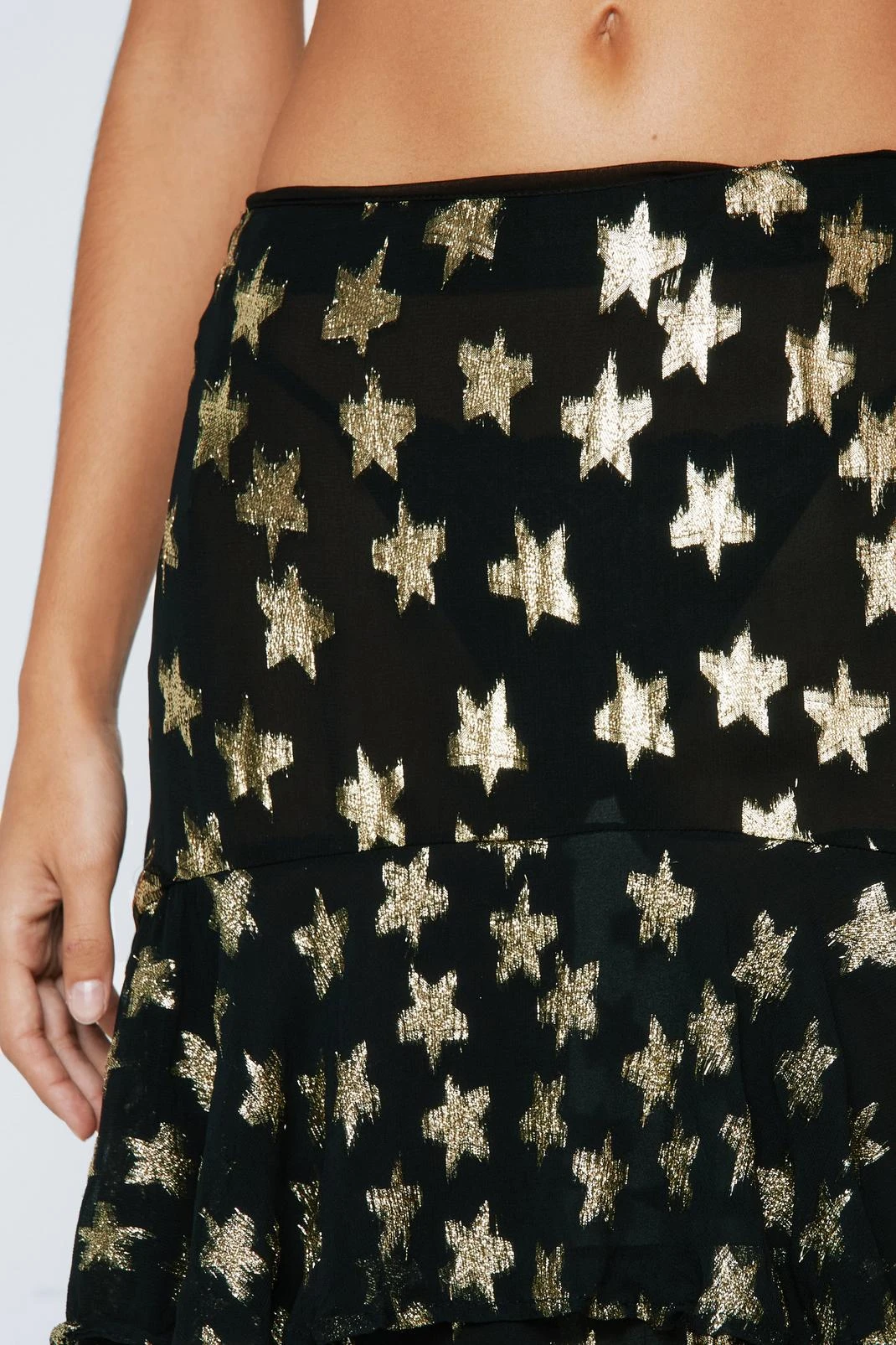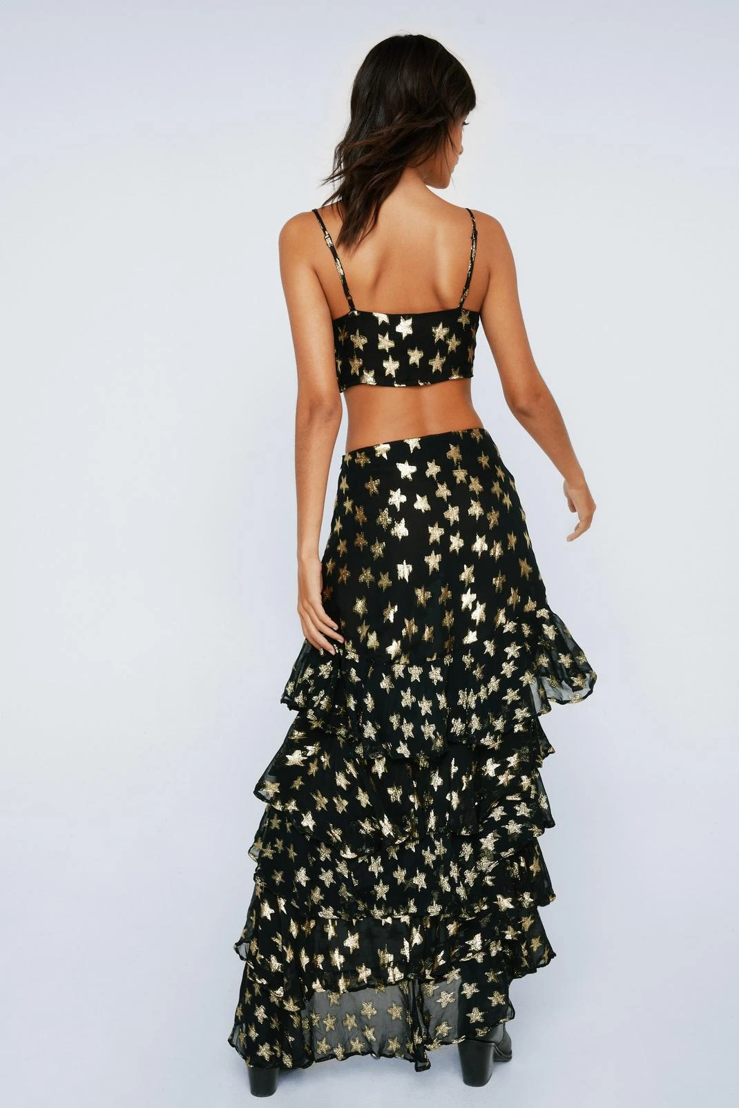 Skirt around it. Feel fierce in our maxi skirt, with eye catching metallic detailing, a dramatic ruffled skirt, and a flattering high waisltine. Pairs well with the matching crop top for a failsafe occasion look, perfect for vacation nights and upcoming parties.