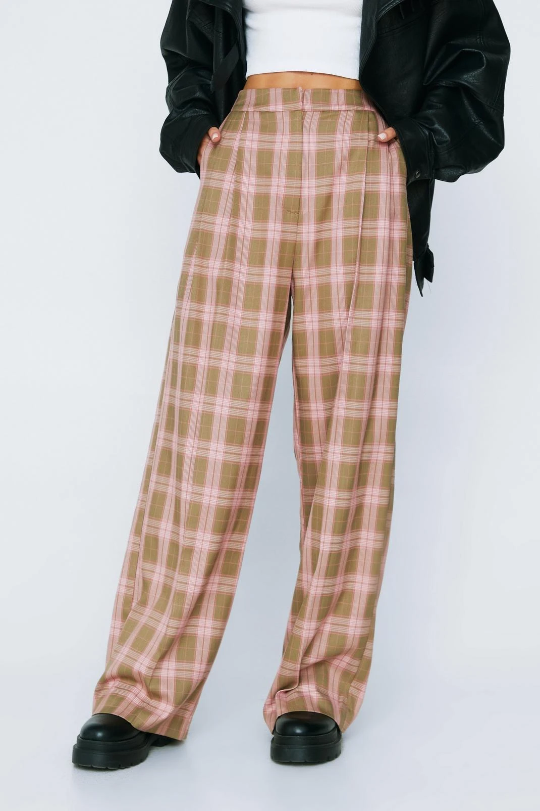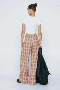 Leg day. Feel elevated when you slip into our wide leg pants. With a classic plaid print in a colorful palette, a comfortable wide leg fit, flattering mid rise waistband, and a formal pleat detail, these pants can easily be paired with a crop top or shirt for a look that will take you seamlessly from day to night. Perfect for dinner dates and drinks, happy hours, and coffee catch ups.