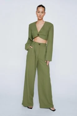 Get a little dressed up. Feel fierce in our wide leg pants, with an ultra flattering wide leg fit, pleat detailing, and a tortoise shell style button. Pairs well with the matching cropped blazer and strappy heels for a look perfect for wedding guest days, prom nights, and upcoming occasions.