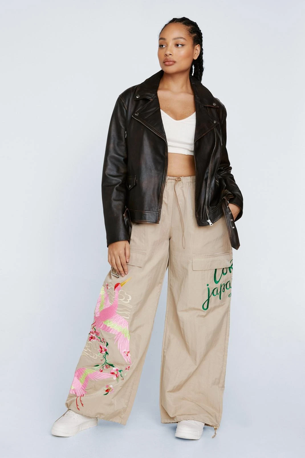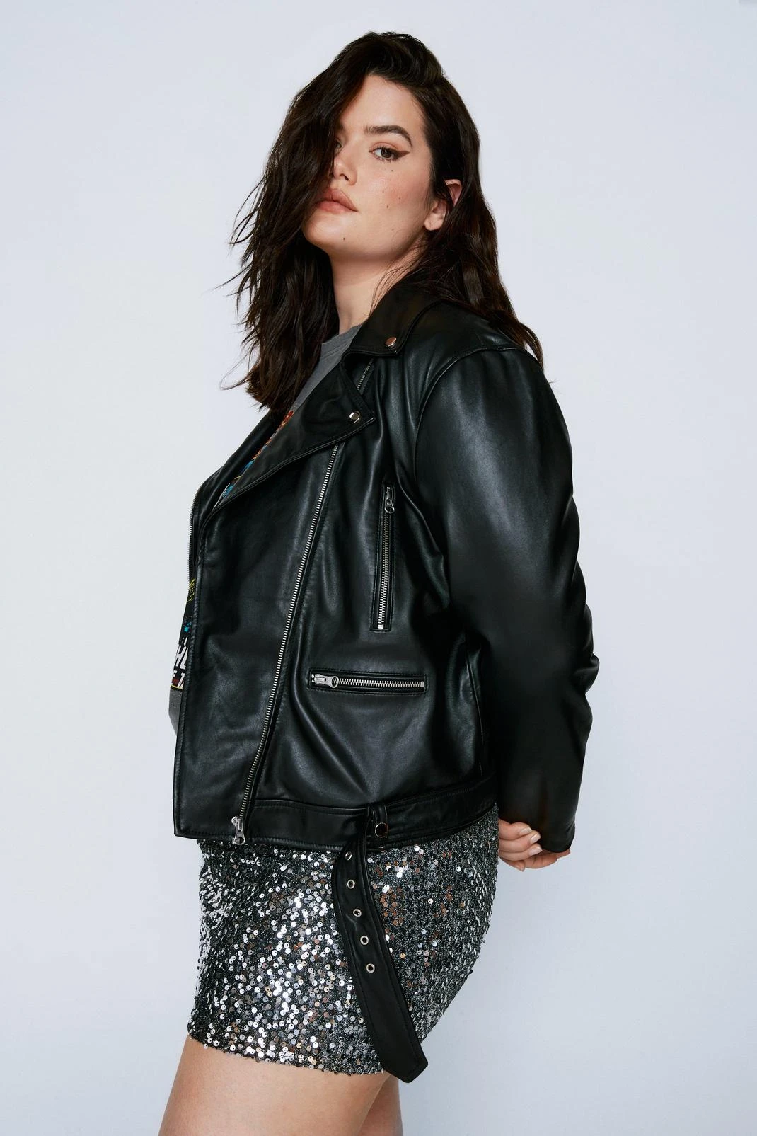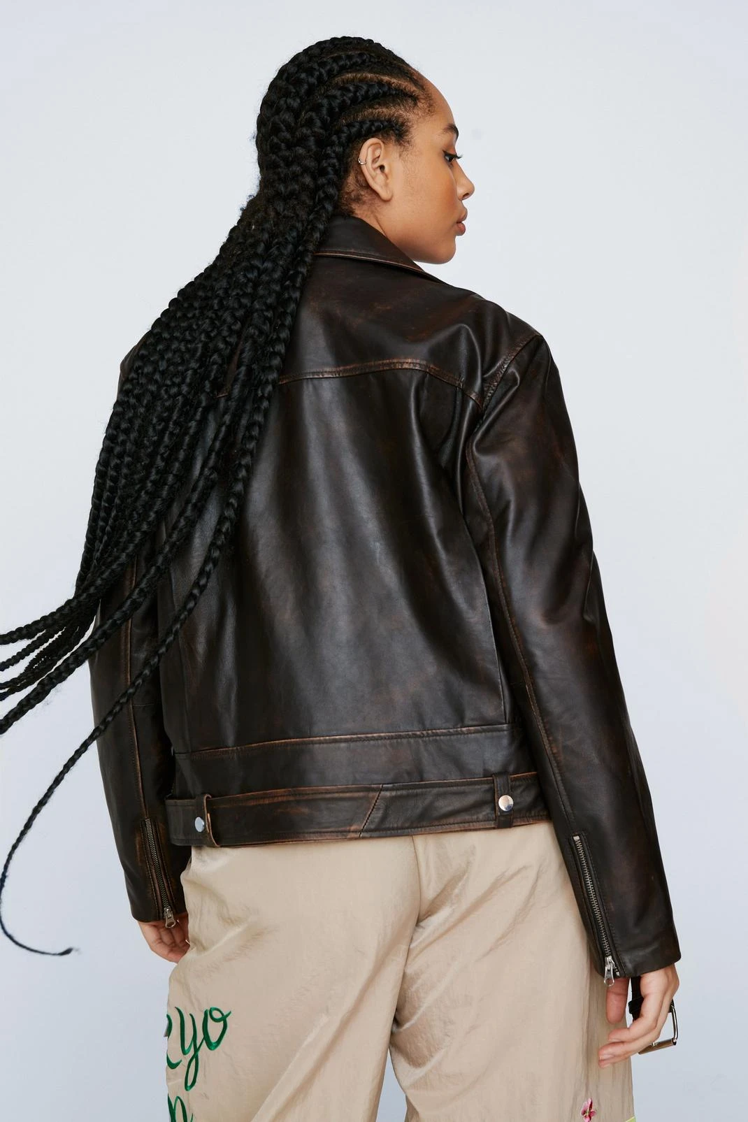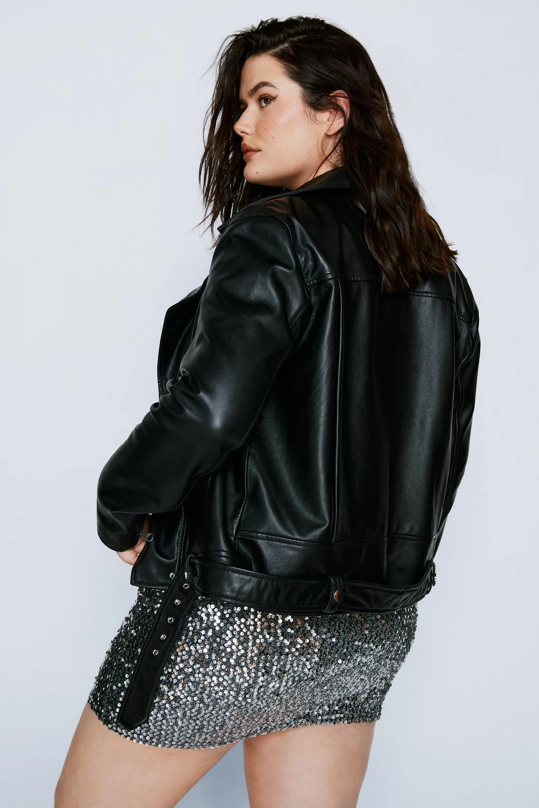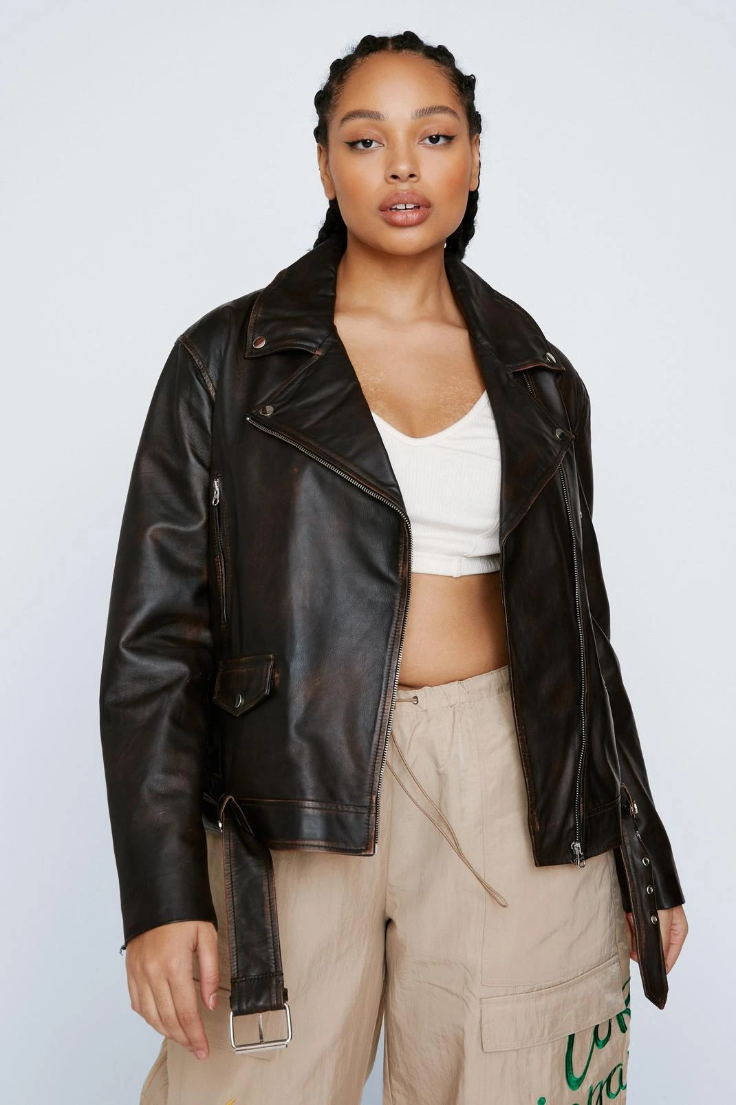 Get leathered. Feel fierce when you add our leather jacket to your look, made in a high quality real leather, with an ultra comfortable oversized fit and edgy belt and zip features. Pair it with your fave day out looks and wear it anywhere, from festival weekends to parties to brunch dates.