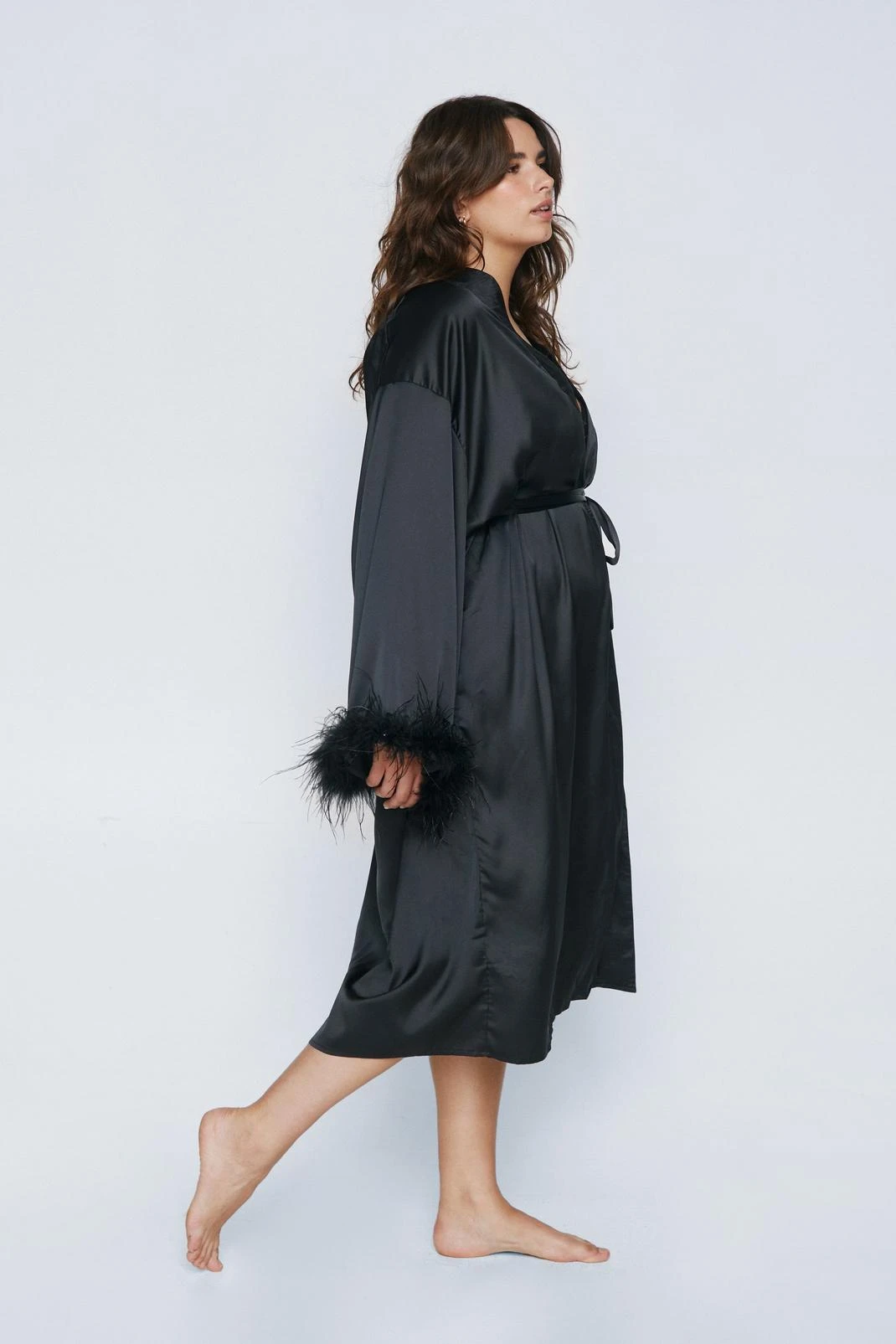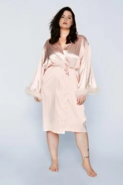 Plus Size Feather Trim Satin Longline Robe