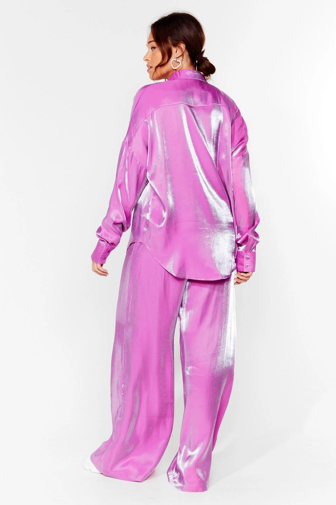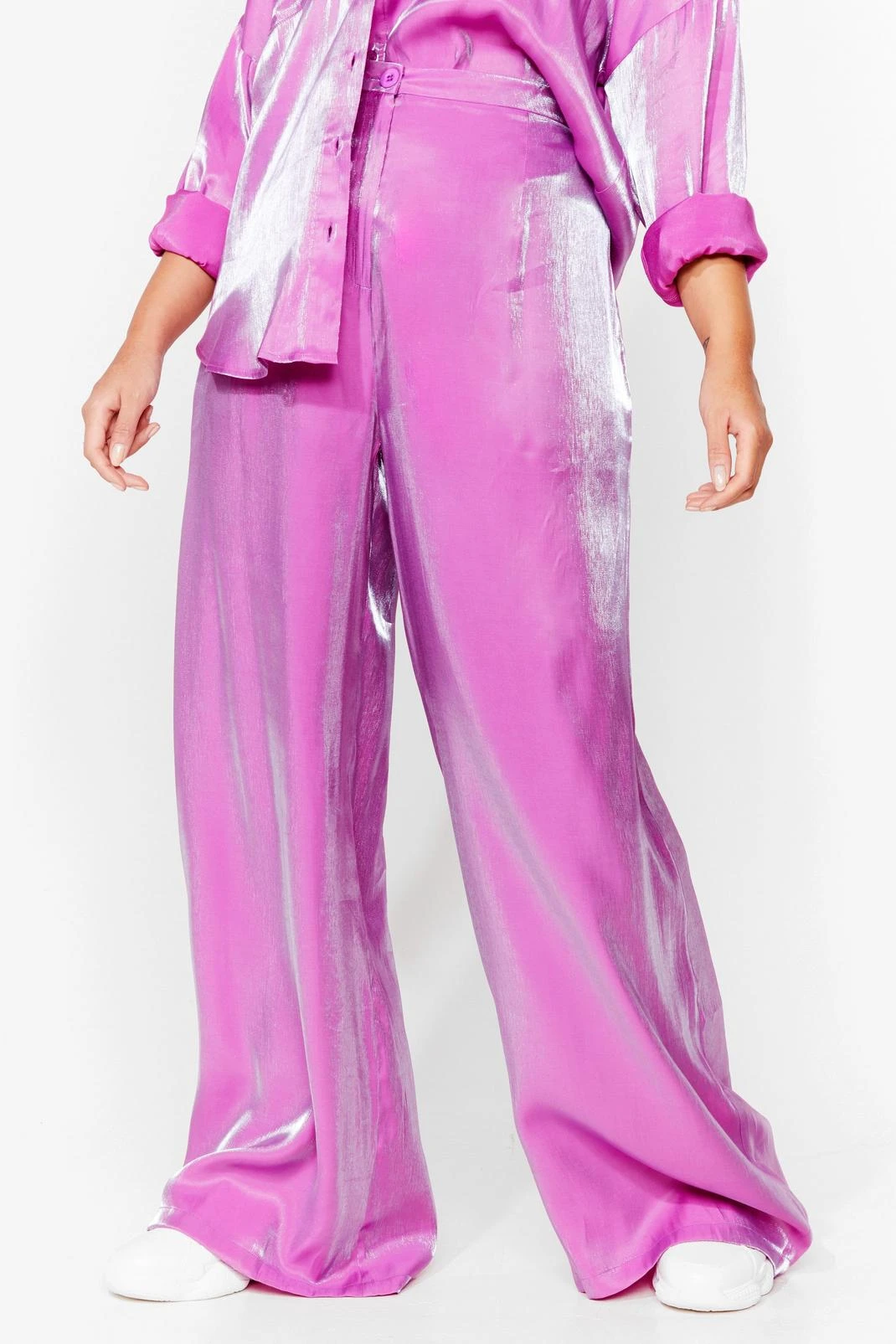 Statement pieces for your lower half. These plus size pants come in satin and feature a high waisted, wide leg silhouette, zip fly closure, and shimmer finish throughout. Looks awesome with the matching shirt and a pair of chunky sneakers. Item sold separate. Model is 5’11” and wears a US size 12/UK size 16.