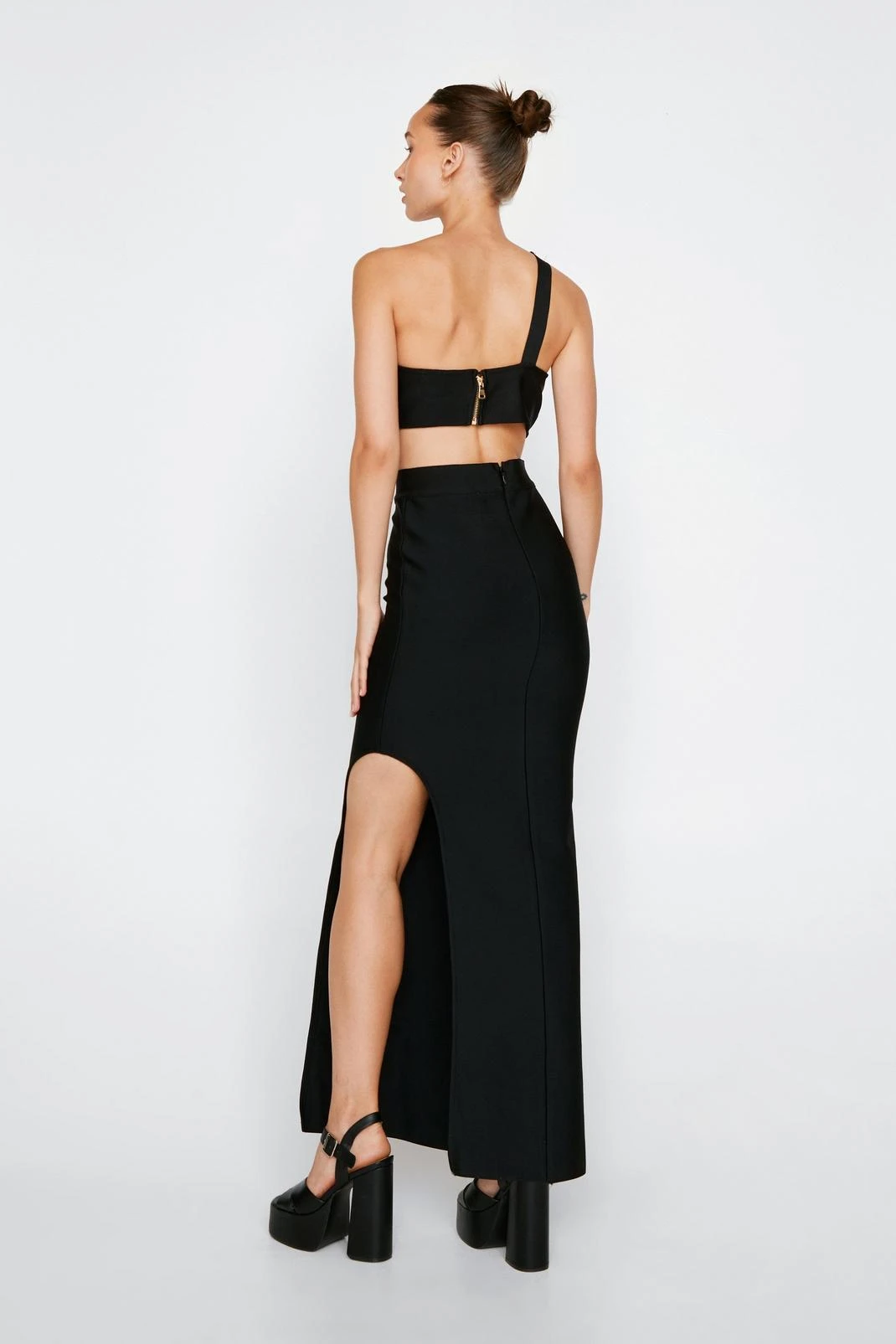 Heads will turn. Style this bralet and skirt two-piece with chunky heels and an evening bag.