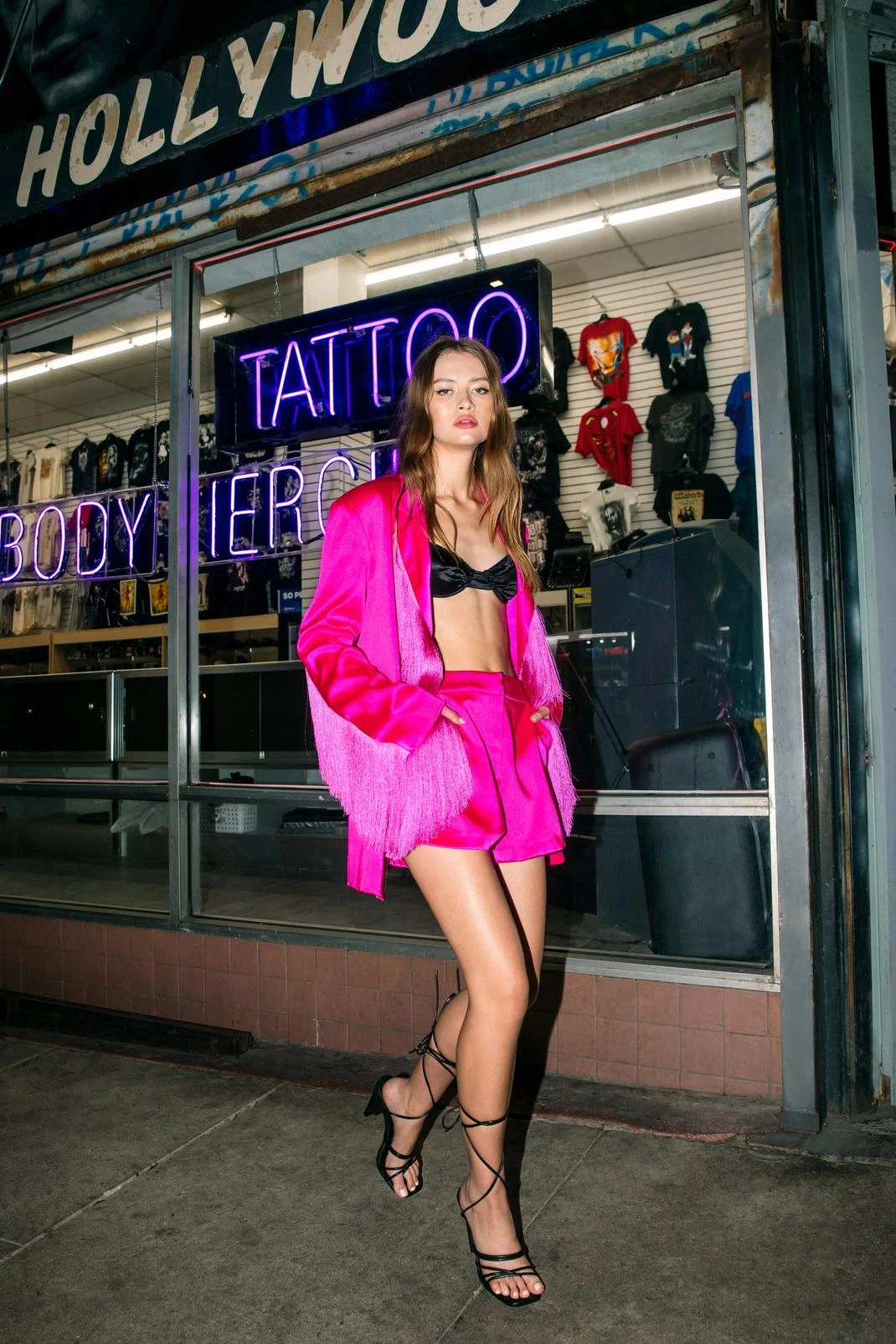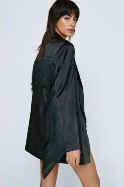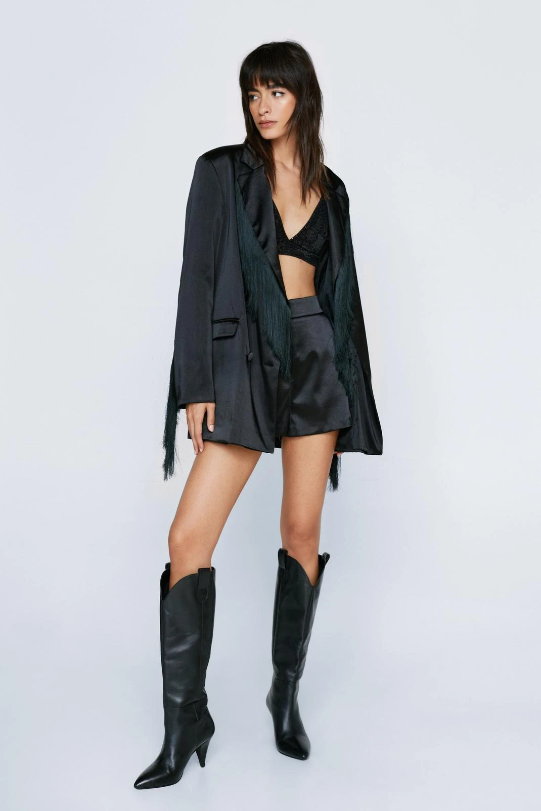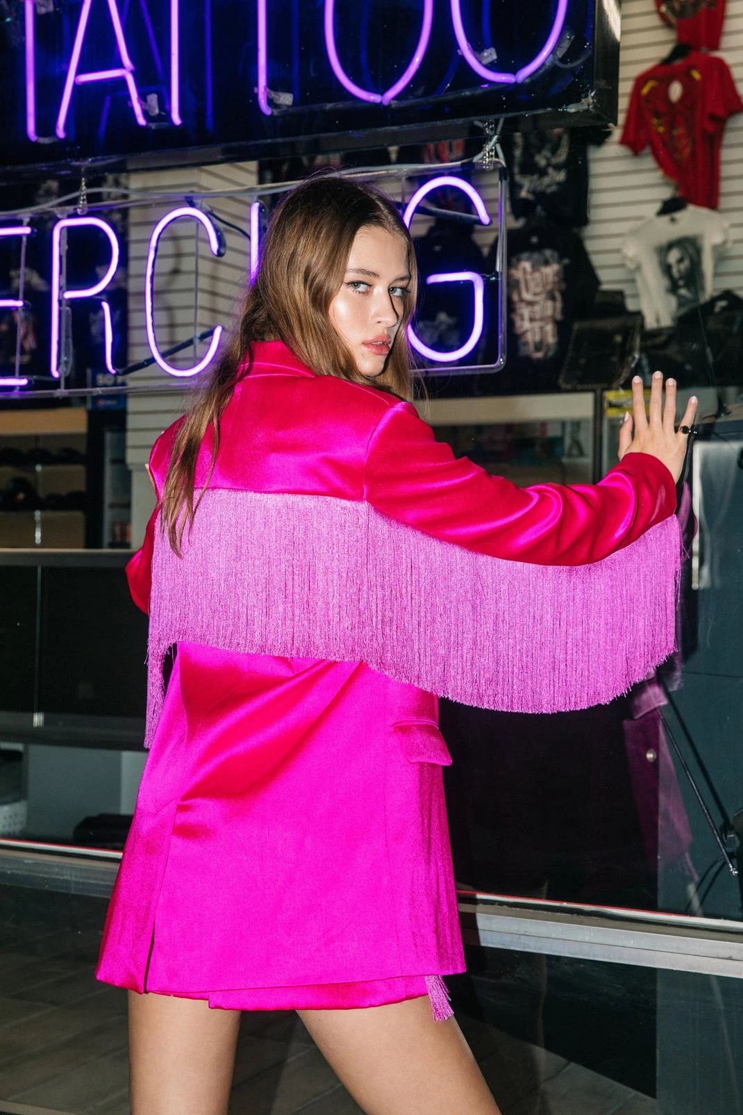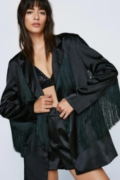 Smooth operator. Feel formal in our bonded satin blazer with fun fringe detailing. Pairs well with the coordinating shorts for a matching moment that will take you to any party.