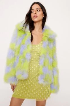 Feather weather. Our real feather coat is made in a fun checkerboard pattern, perfect for adding a pop of color to your looks.