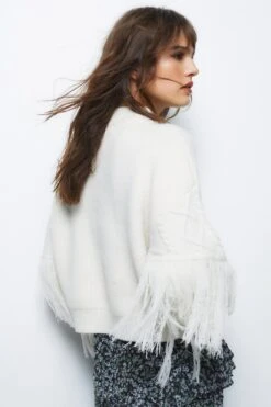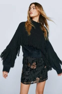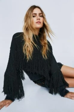 Talking texture. Cozy up as the cold weather draws in in our premium high neck fringe sweater.