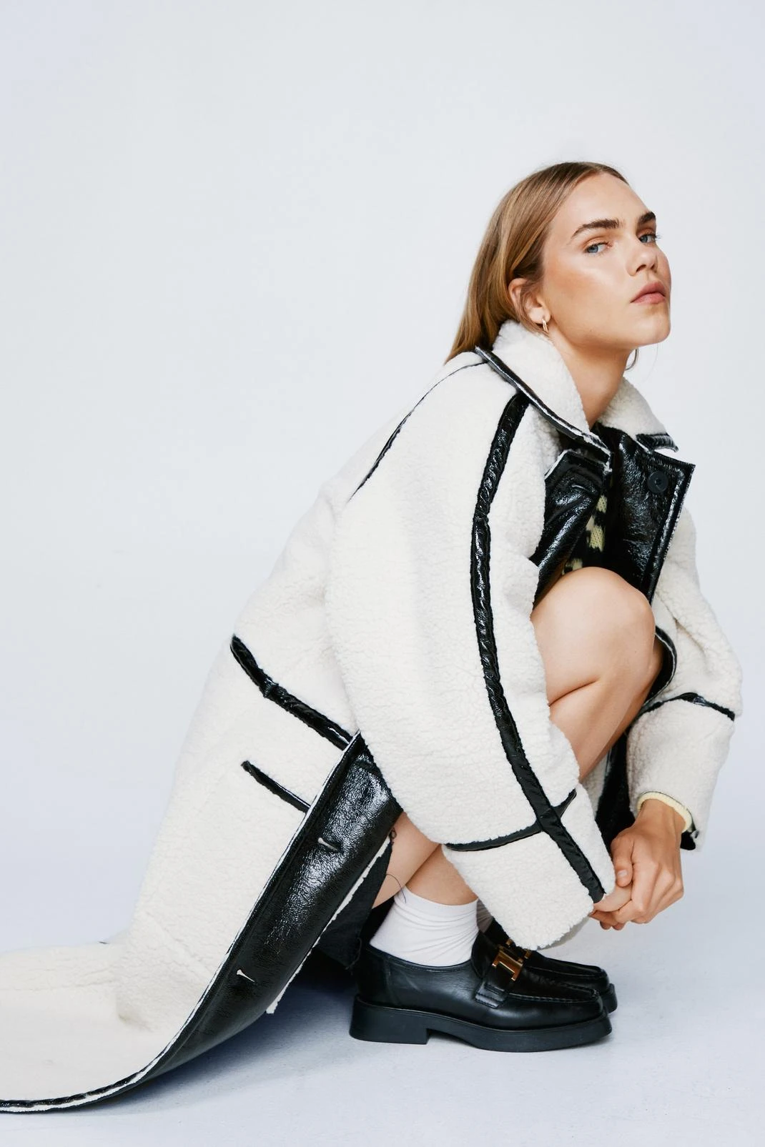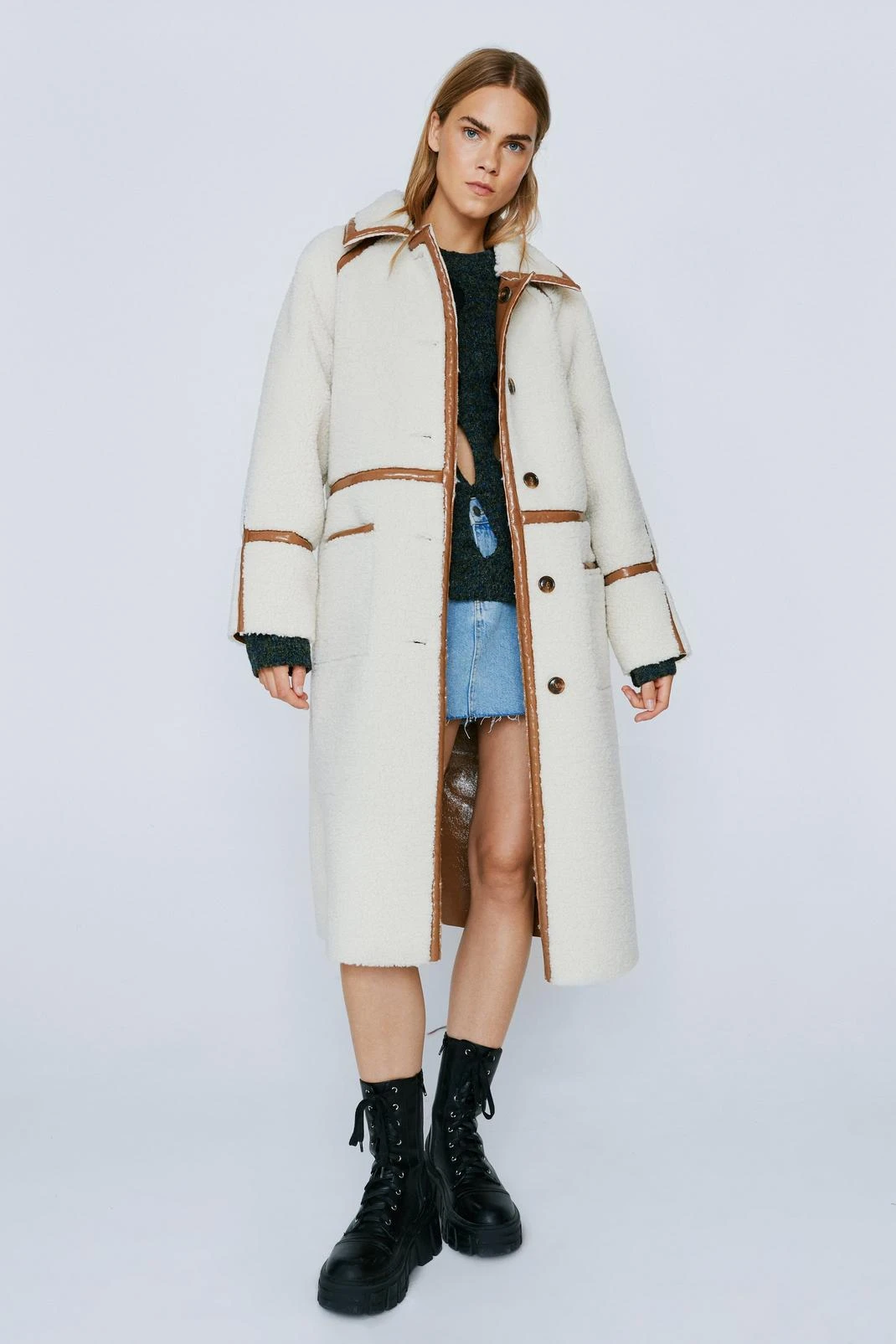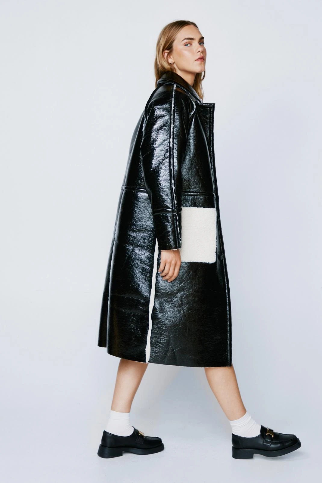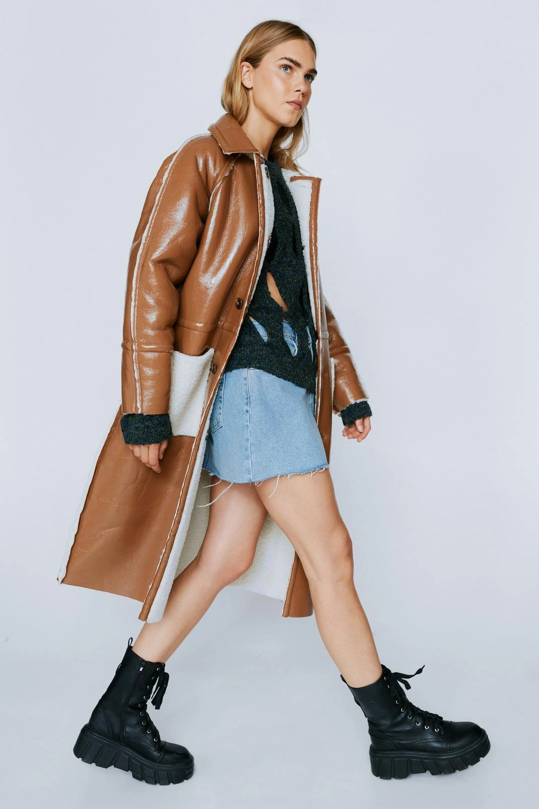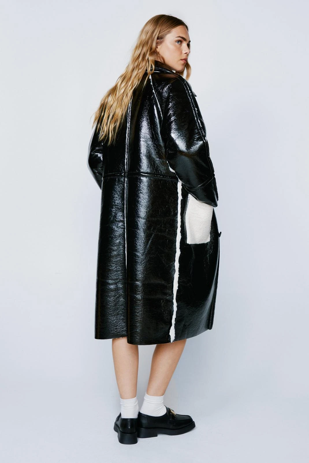 Twice as nice. Feel prepared for any eventuality with our reversible coat, with a high quality faux leather on one side and fluffy borg on the other. Wear in any weather and the longline structure will protect you from the cold.