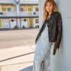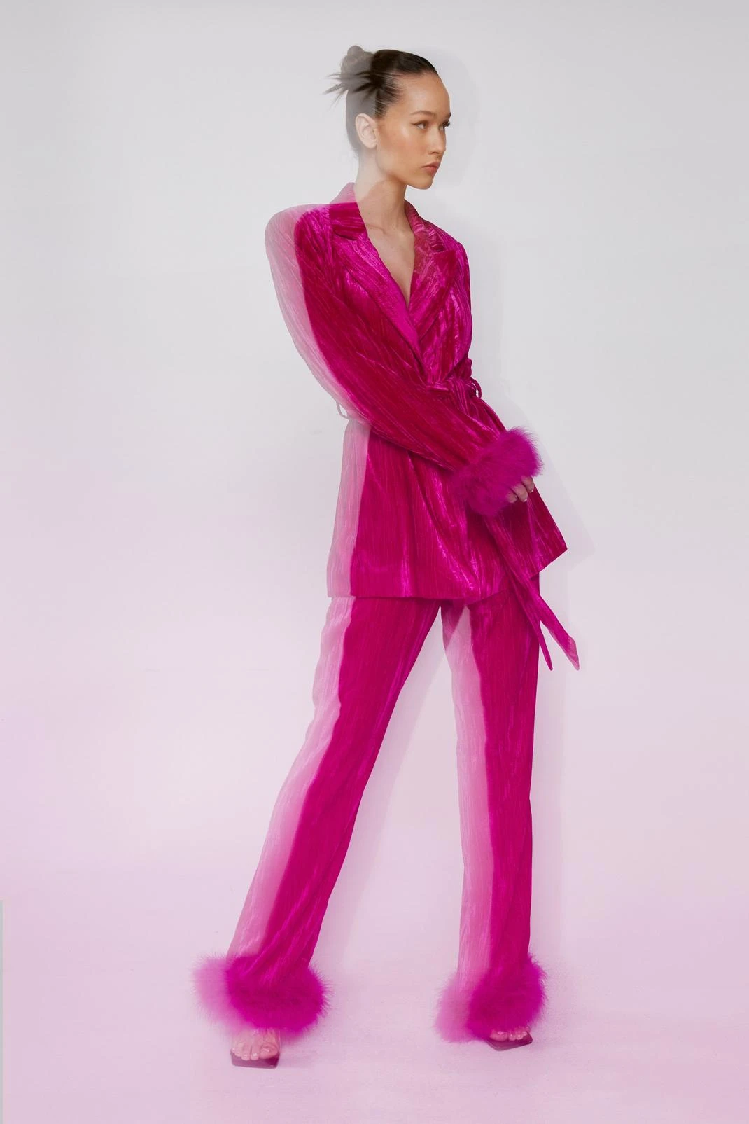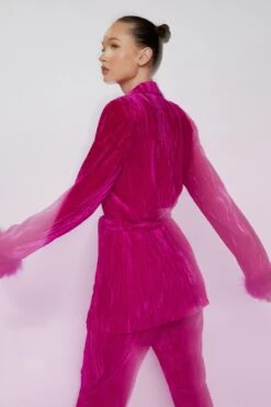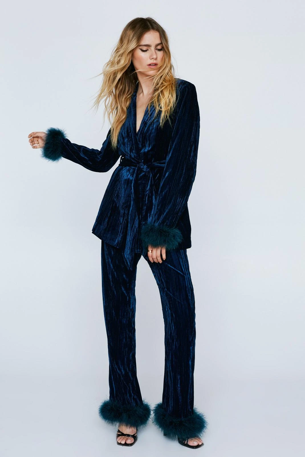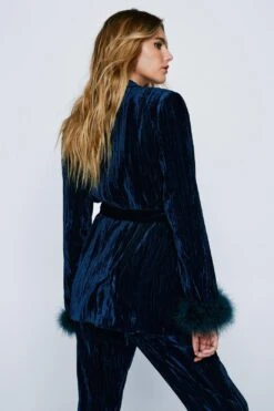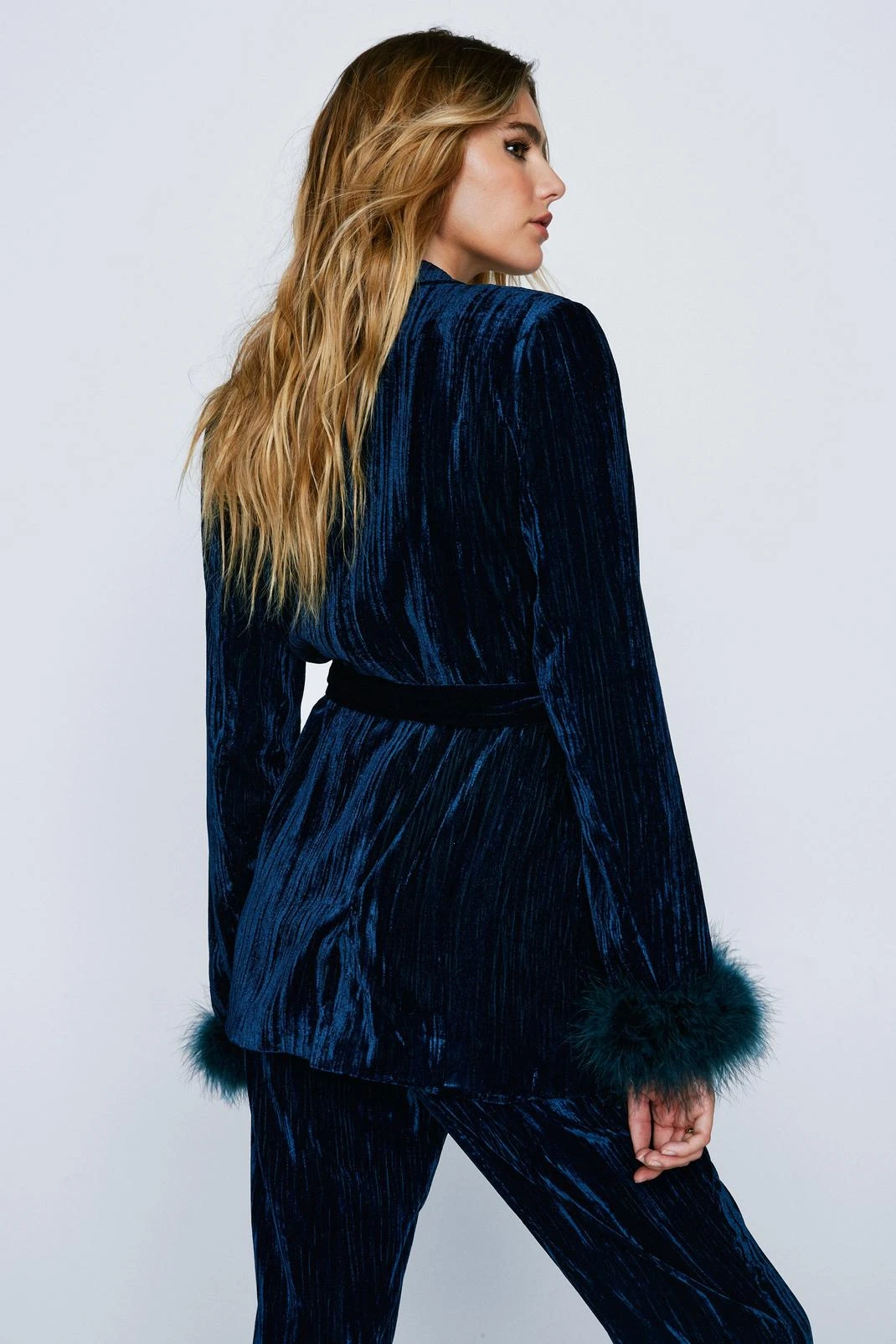 Velvet dream. Our premium velvet blazer features a tie waist and feather cuffs for an elevated twist on the boardroom classic.