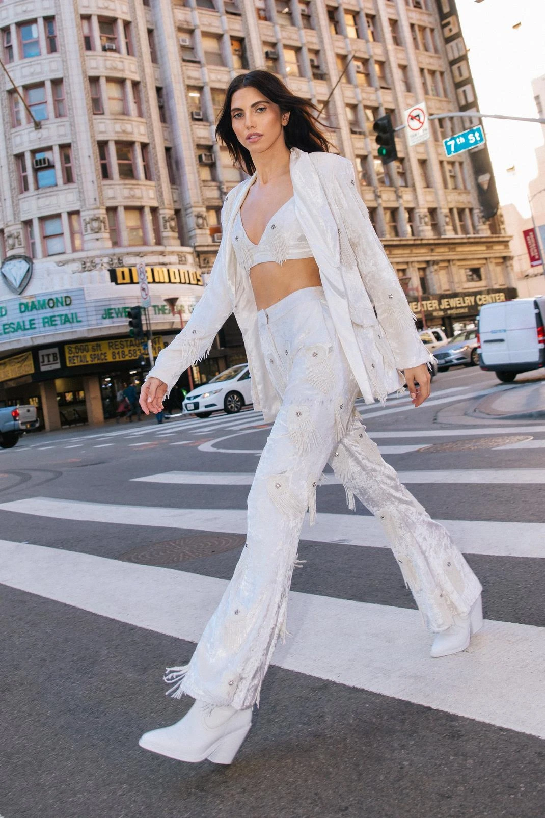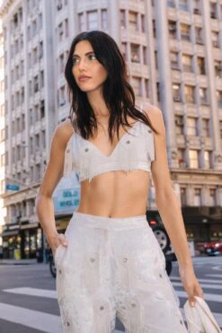 Elevated occasion looks. Feel ready to party in our bralette, made in high quality velvet fabric, with hand embellished tassels and metallic and diamante flower detailing. Pair it with the matching separates and chunky heels for a party look you’ll turn heads in, perfect for dancefloors and drinks.