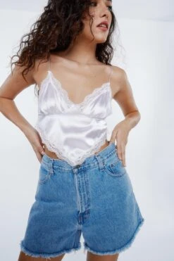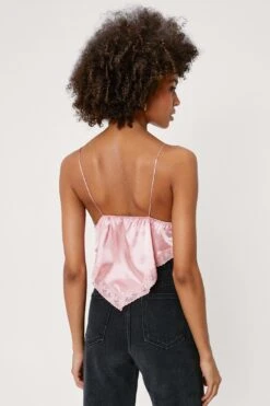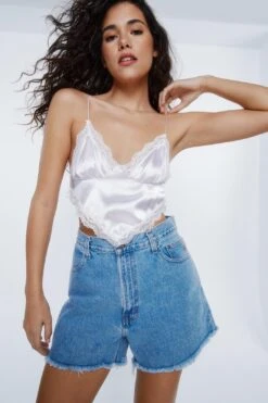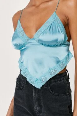 Truly, madly, deeply. This top comes in satin and features a relaxed, cropped silhouette, uneven hem, plunging V-neckline, cupped design, lace trim throughout, and spaghetti straps. Model is 5’8″ and wears a US size 6/UK size 10.