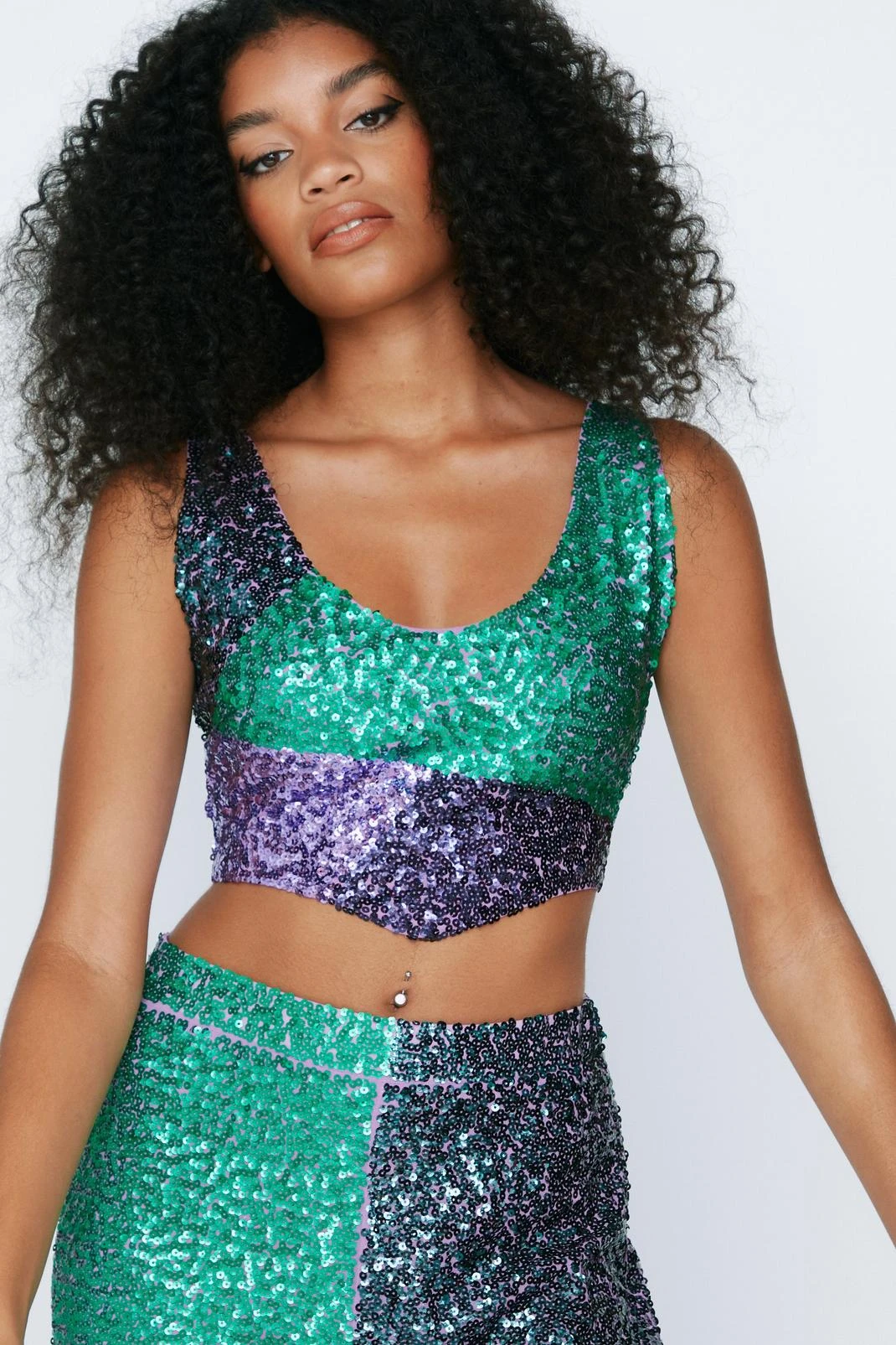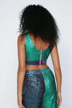Your new go-to. Feel confident in our bralette, made in high quality sequin fabric, with a stellar fitted silhouette, and a head turning colorblock pattern. Pairs well with the co-ordinating pants for an elevated look that will take you anywhere from parties and happy hours to festivals and upcoming occasions.