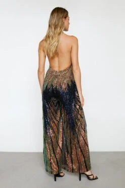 Sequin season. Turn heads and feel like the center of attention in our sequin jumpsuit, with wide leg design and halterneck structure. Pair with strappy heels and social gatherings.