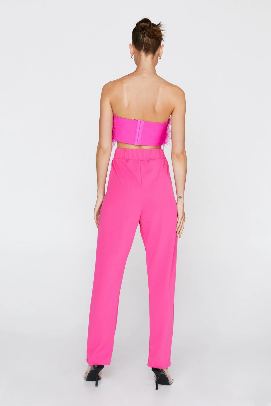 Tailored moments. Style with a feathery bandeau top, and square toe mule heels.