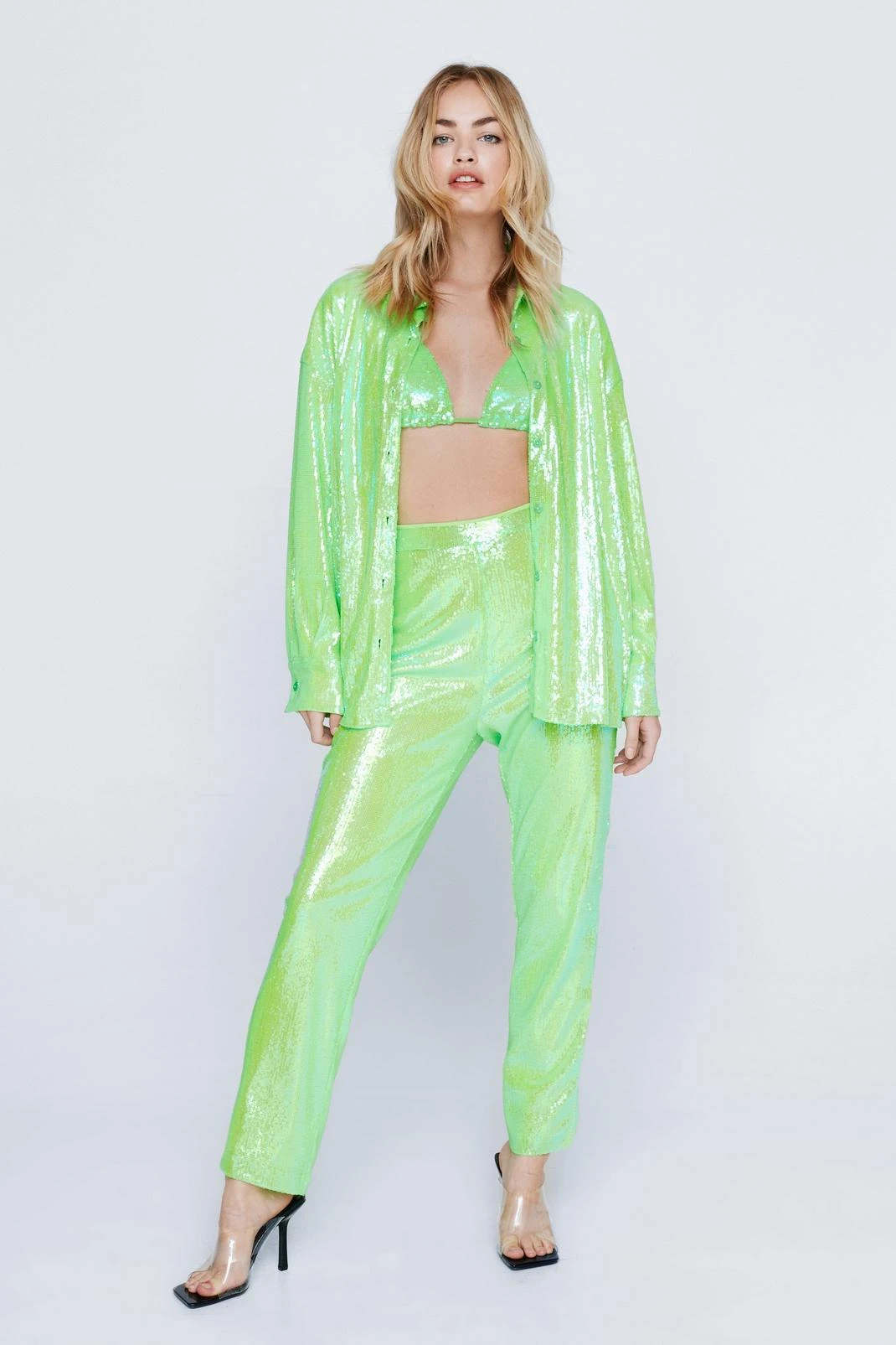 Time to shine. Style our strappy sequin bralet with the matching pants and shirt, or with leather pants and a jacket for a more low-key approach.