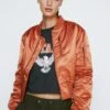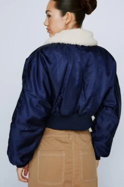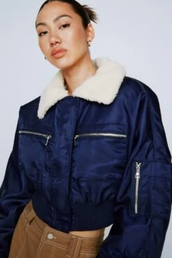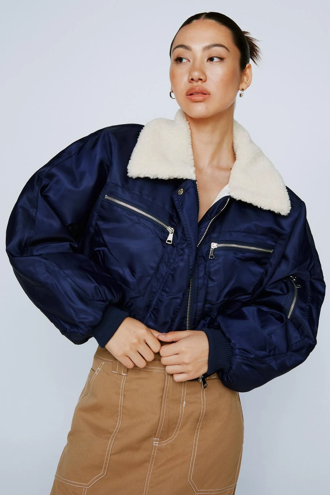 Prepare for take off. This bomber jacket comes in soft, silky fabric and features an oversized cropped silhouette that sits just above the hips, puff sleeves, zip-front closure, an oversized collar lined with cozy sherpa fabric, and zip detailing throughout. Throw on over a t-shirt and jeans to complete the look.