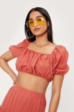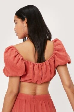 Two’s a crowd… But we kinda like it. This bralette features a square neckline at front and back, puff sleeves, cropped silhouette, and elasticized underbust. Rock with the matching midi skirt and chunky sandals. Model is 5’8″ and wears a US size 6/UK size 10.