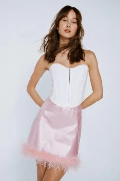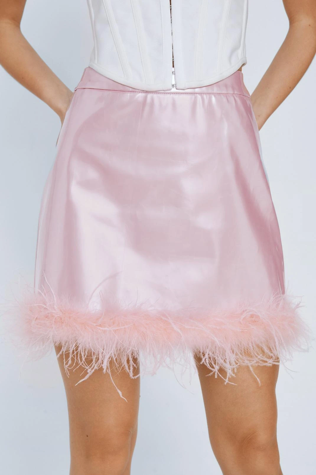 Ultra femme. Style our vinyl feather hem mini skirt with a corset top or crop top for a cute evening look.