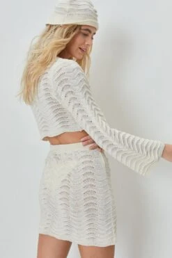 Wave Crochet Crop Top Mini Skirt And Bucket Hat 3 Pc Set